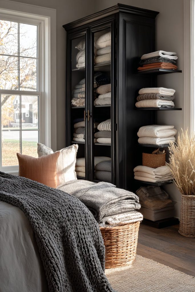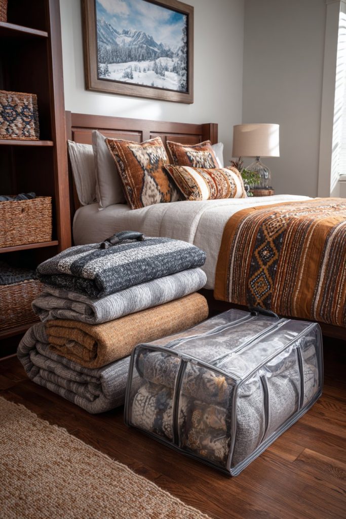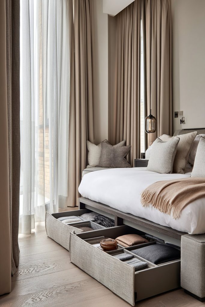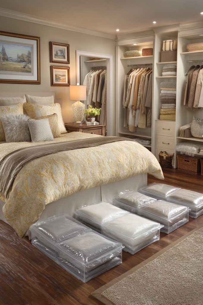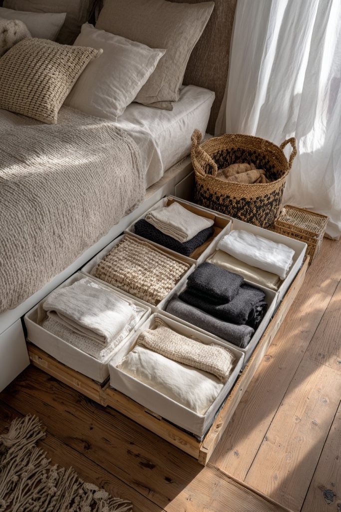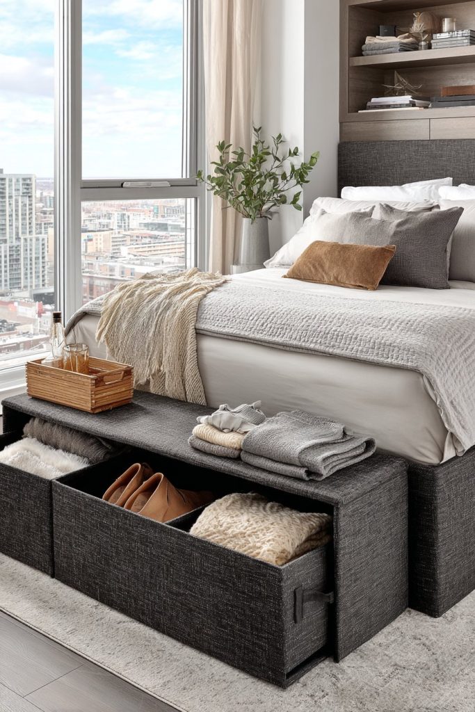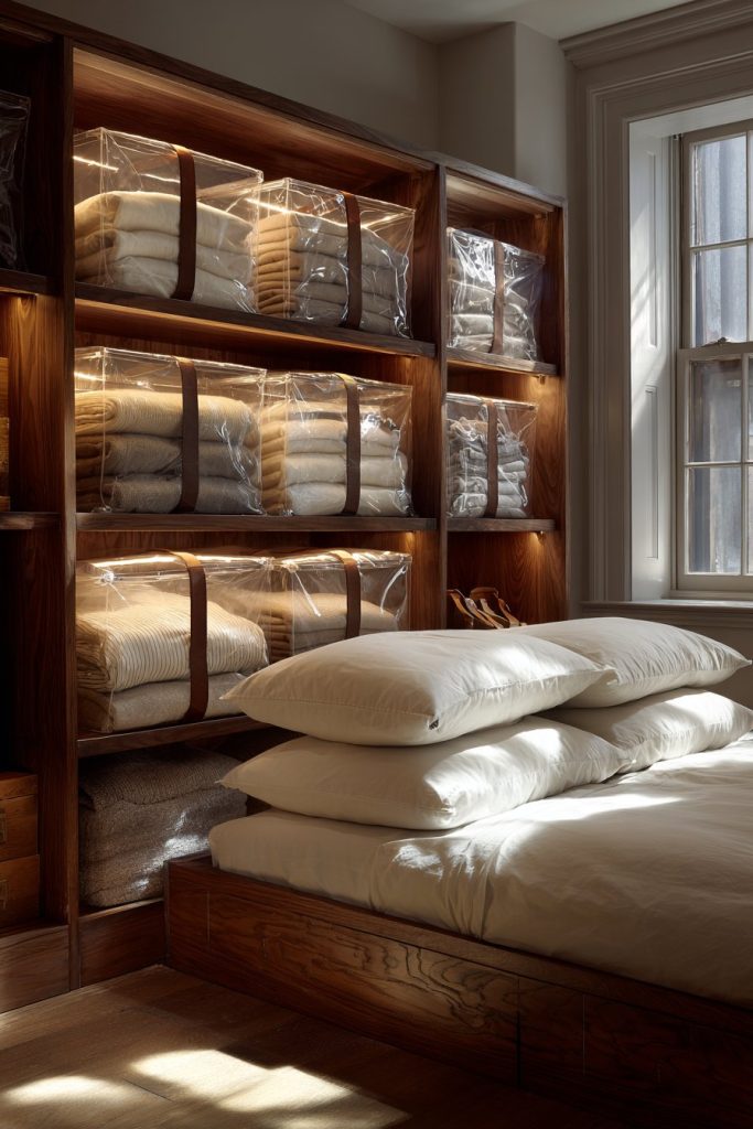 Professional interior photography demonstrates practical storage methods that address real-world bedroom organization challenges. These solutions provide valuable strategies for managing seasonal items and bulky bedding in limited storage spaces.