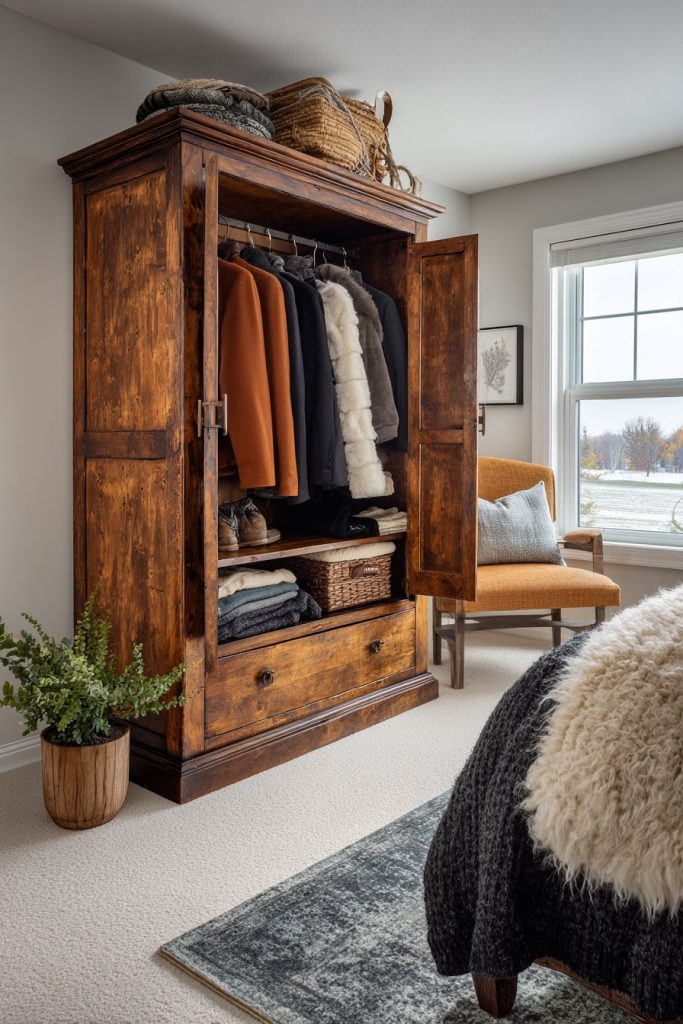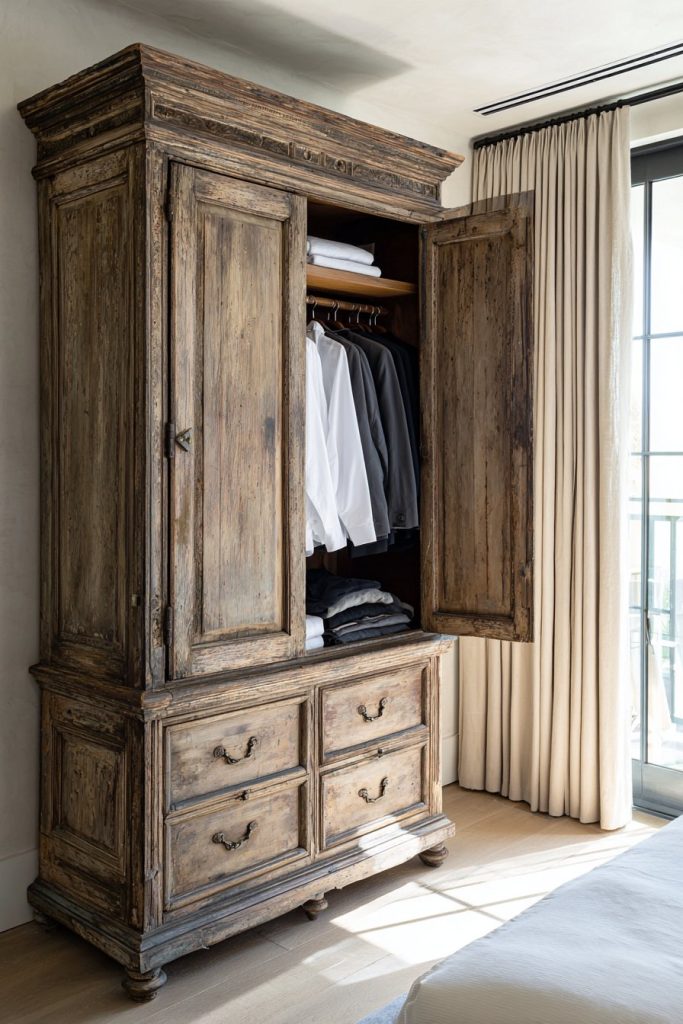 Vintage armoires offer unique opportunities to combine character-rich furniture with modern storage needs. These substantial pieces can be modified with adjustable shelving and contemporary hanging systems while preserving original hardware and natural wood patina. The blend of vintage charm with practical functionality creates distinctive bedroom storage solutions that serve as room focal points.