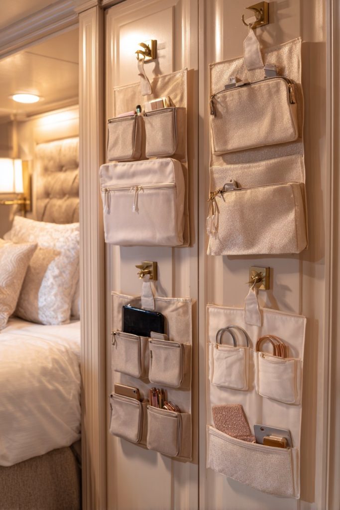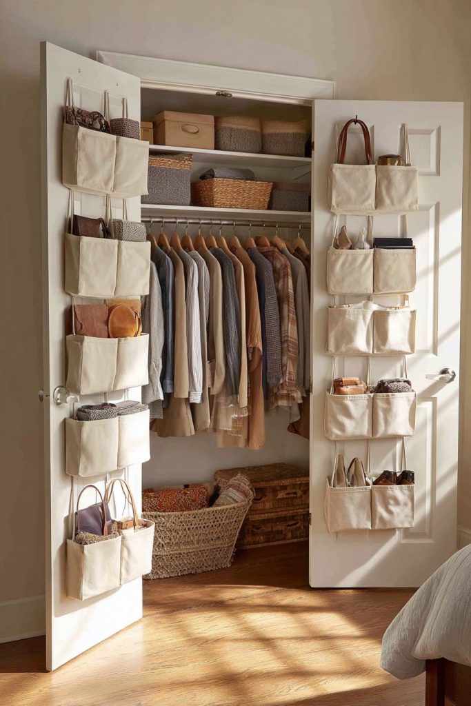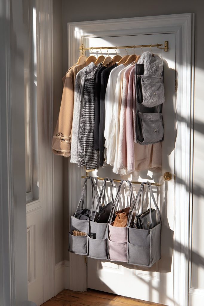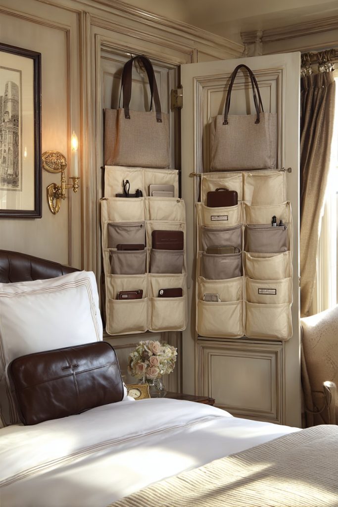 Door spaces represent often-overlooked storage opportunities that can significantly increase bedroom organization capacity. Over-door organizers and hook systems maximize vertical storage while utilizing areas that typically remain unused. Multiple pocket organizers in neutral fabric colors provide discrete storage for accessories, small items, and daily necessities.
