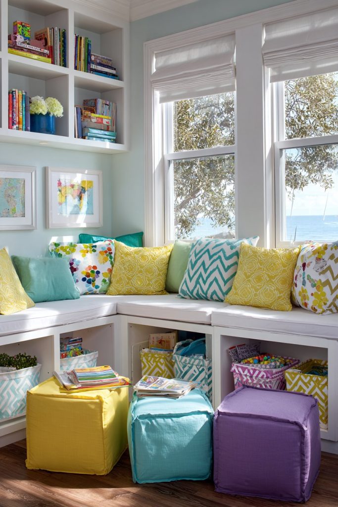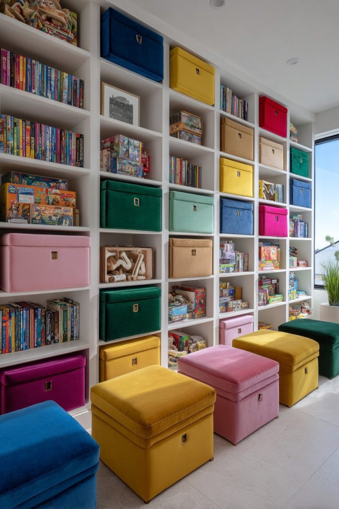 The playful nature of colorful storage solutions adds personality to bedroom environments while addressing practical storage needs for games, books, electronics, and personal items. Natural light through windows illuminates the vibrant colors and diverse textures, creating dynamic bedroom environments that reflect individual personalities and interests.