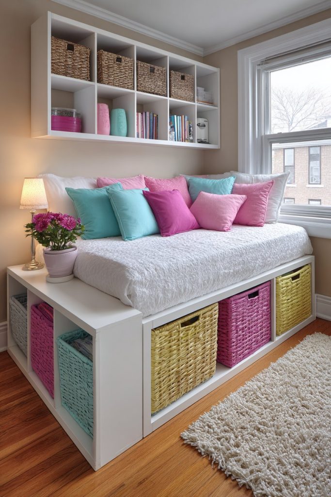 Teenage and young adult bedrooms benefit from storage solutions that reflect youthful energy while providing practical organization. Colorful storage ottomans in various sizes serve multiple functions as seating, storage, and room accent pieces. The ability to rearrange these pieces throughout the space provides flexibility for different activities and room configurations.