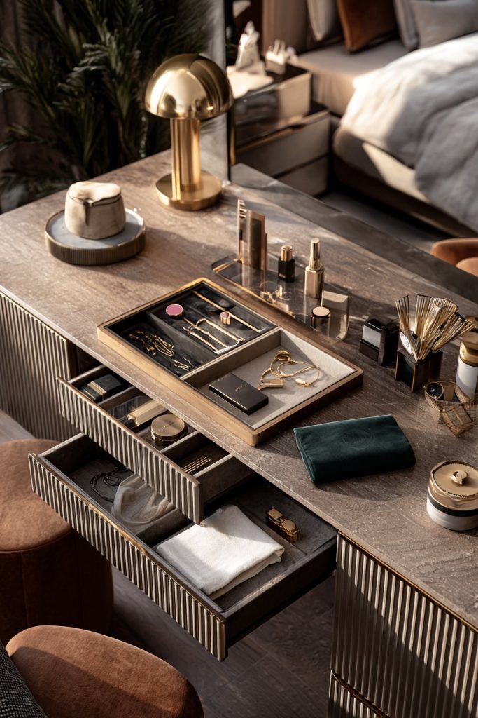 Wide-angle interior photography captures the comprehensive functionality and elegant design of dedicated dressing furniture. These pieces serve as both practical storage solutions and beautiful room features that enhance overall bedroom luxury and functionality.