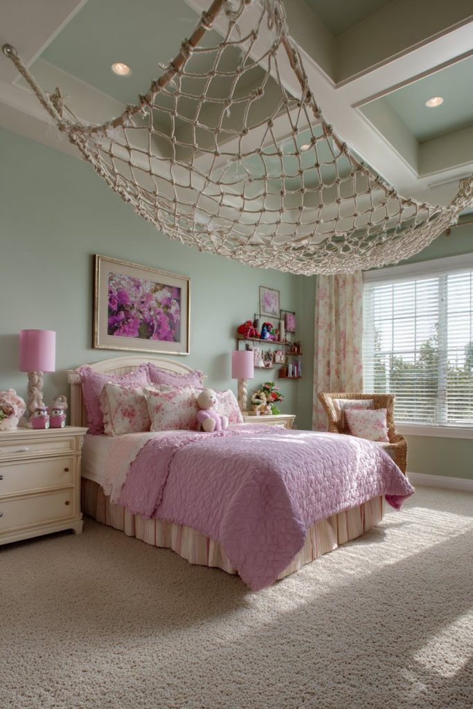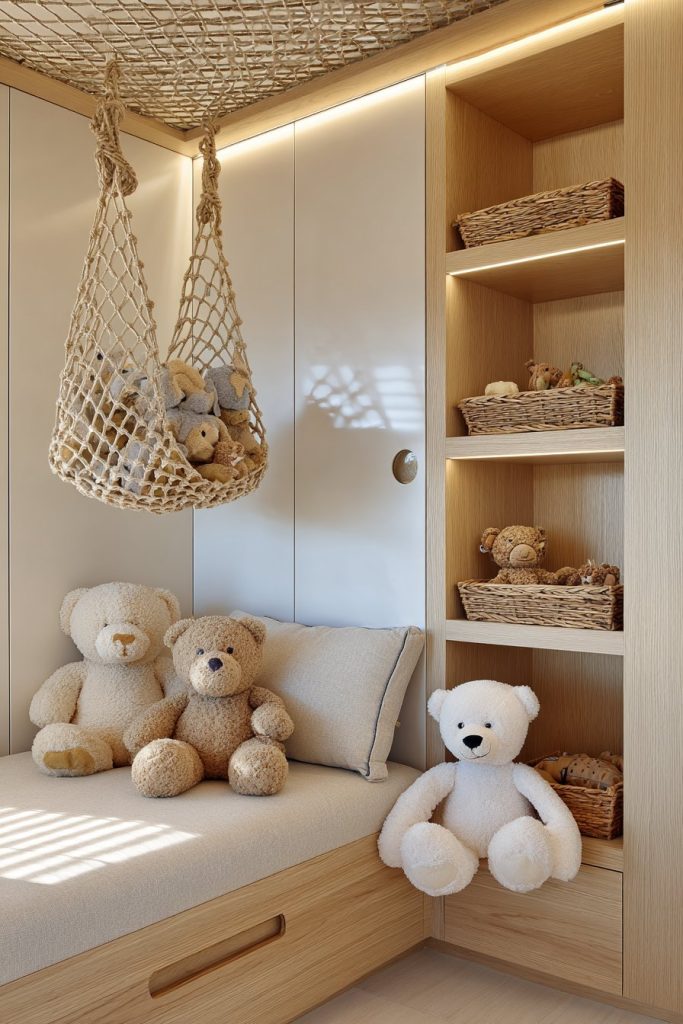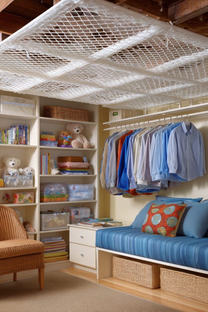 The innovative nature of overhead storage adds visual interest to bedroom ceilings while providing practical storage benefits. Soft room lighting creates intriguing shadow patterns from suspended storage systems, adding dynamic visual elements to bedroom environments. The creative problem-solving approach demonstrates how storage challenges can inspire unique design solutions.