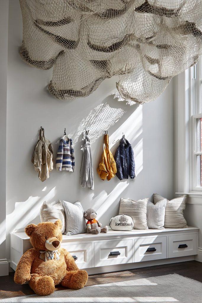 The accessibility of ceiling-mounted systems ensures stored items remain usable rather than merely archived. Interior design photography emphasizes the creative and practical benefits of thinking beyond traditional storage approaches.