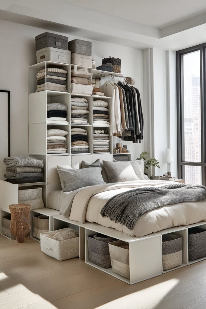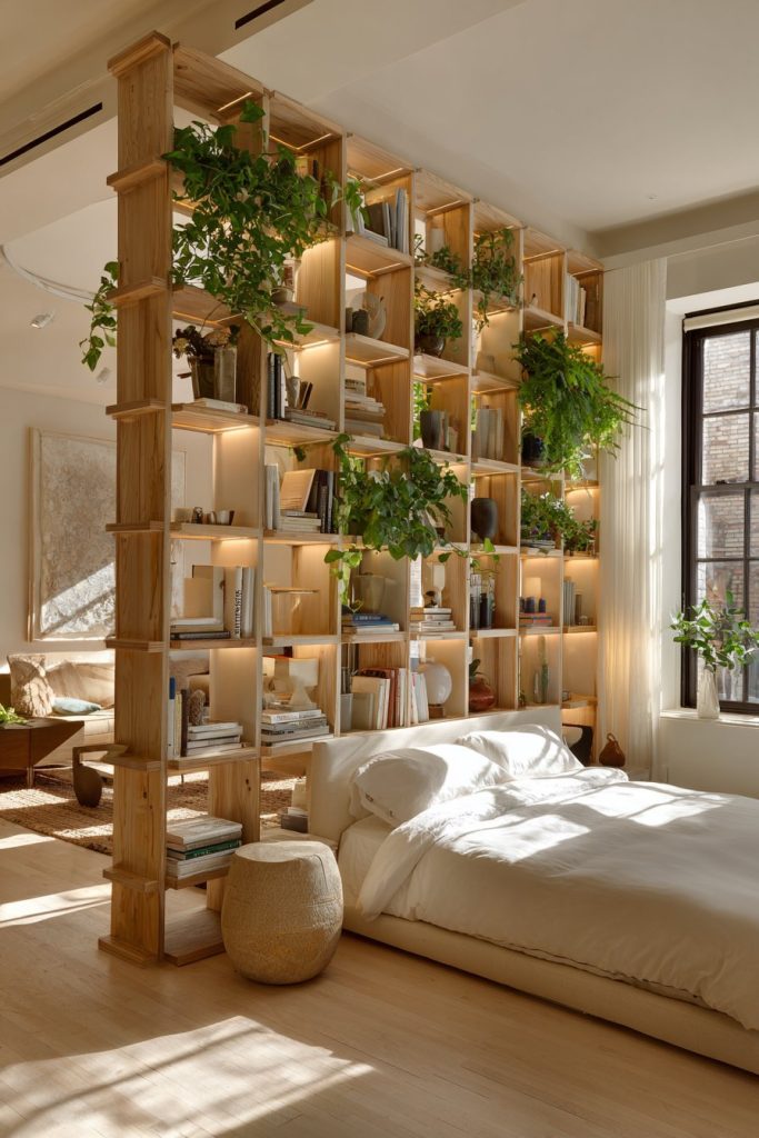 The dual functionality of storage dividers addresses both privacy and organization needs through single furniture pieces. Natural lighting highlights the architectural qualities of these pieces while demonstrating how storage solutions can contribute to overall room design. The ability to define separate zones creates more dynamic and functional bedroom layouts.