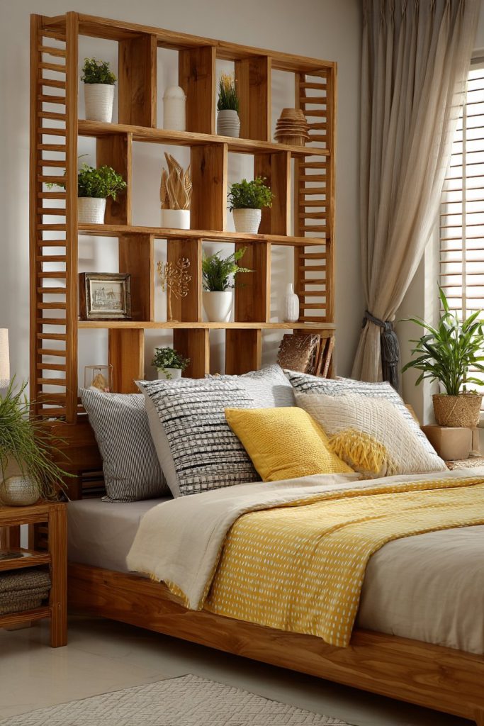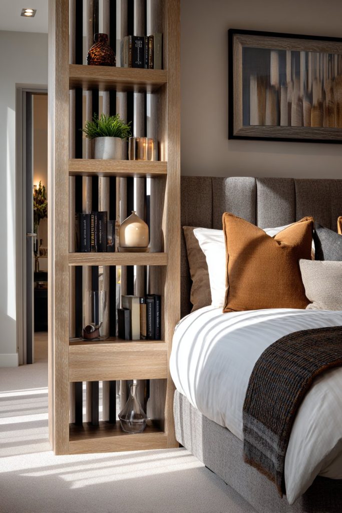 Storage solutions that serve multiple functions offer exceptional value in bedroom environments. Room dividers with built-in shelving create privacy zones while providing display and storage opportunities for books, plants, and decorative objects. Wooden frame construction allows light filtration while clearly defining separate functional areas within larger bedroom spaces.
