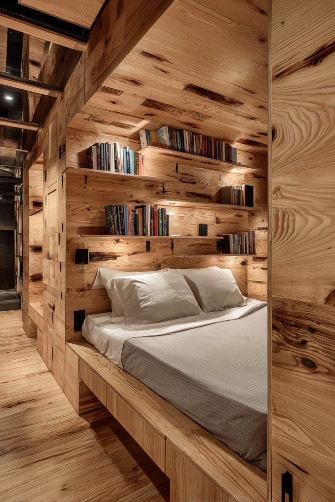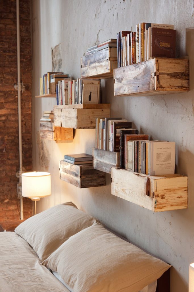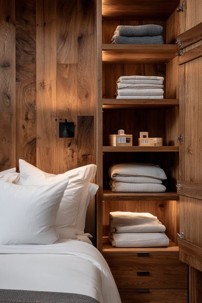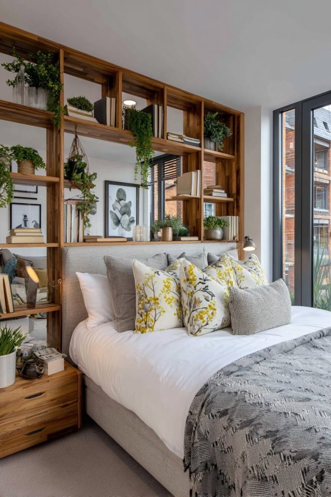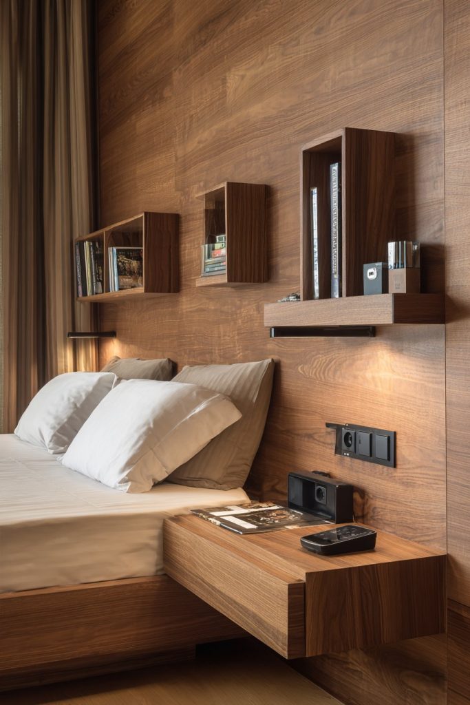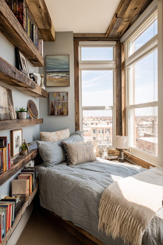 Wall-mounted storage solutions offer significant advantages in smaller bedrooms where floor space comes at a premium. Floating shelves constructed from reclaimed pine wood provide character-rich storage while showcasing natural wood grain variations. The subtle mounting brackets create the illusion that shelves float independently from walls, contributing to clean, modern aesthetic lines.