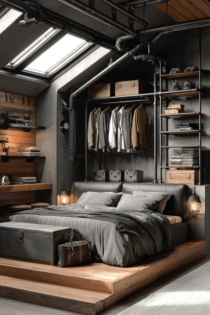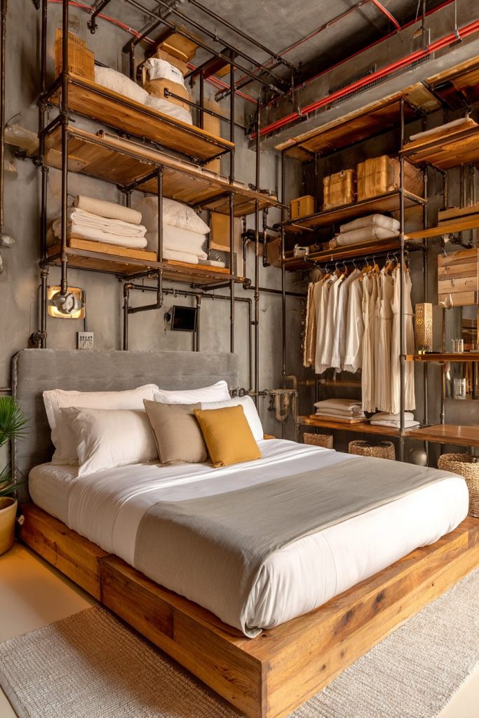 Industrial-style storage solutions celebrate the beauty of functional design while providing practical organization benefits. Exposed metal pipe clothing racks and wooden shelving systems showcase garments and accessories as integral parts of room design. The open storage approach works particularly well in loft-style bedrooms where raw materials and exposed structural elements create authentic industrial aesthetics.
