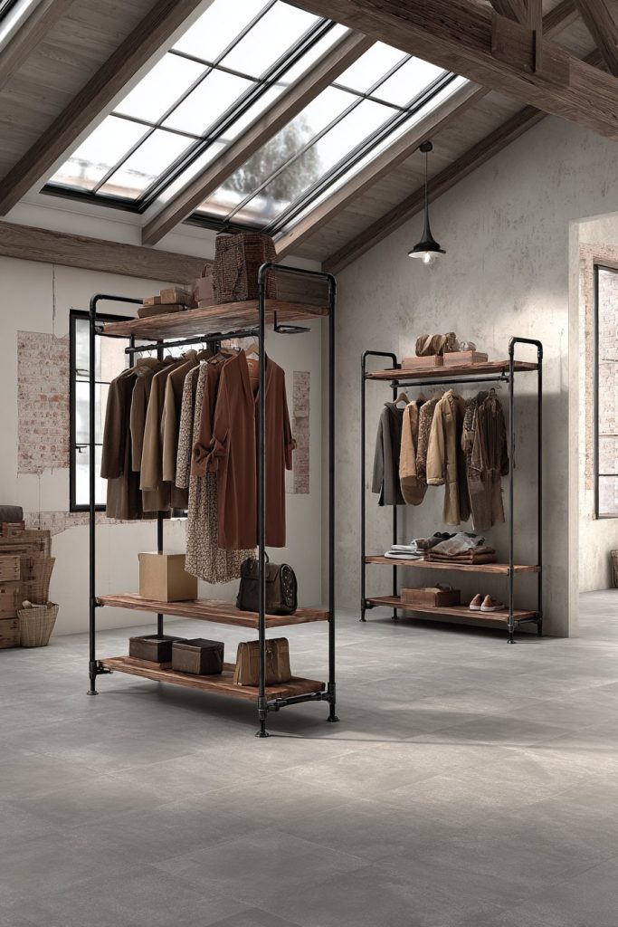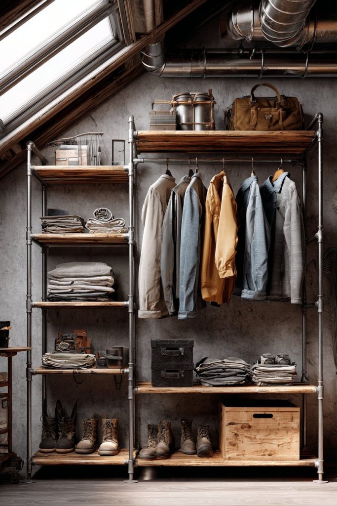 Natural light from skylights emphasizes the material contrasts between metal pipes and wooden shelving while highlighting the intentional design choices in industrial storage systems. The display approach to clothing storage transforms necessary items into design elements that contribute to overall room character and personality.