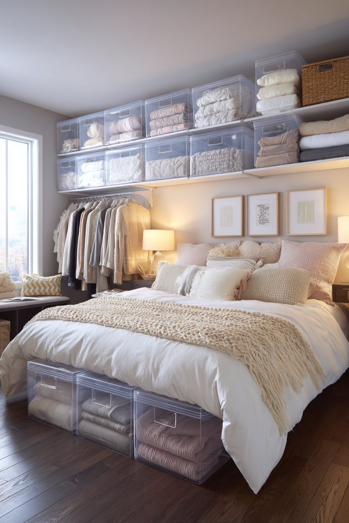 The systematic organization approach demonstrates how practical storage methods can maintain order in real bedroom environments. Natural room lighting reveals the comprehensive organization systems while emphasizing the space-saving benefits of efficient storage techniques. The clear container approach ensures stored items remain visible and accessible.
