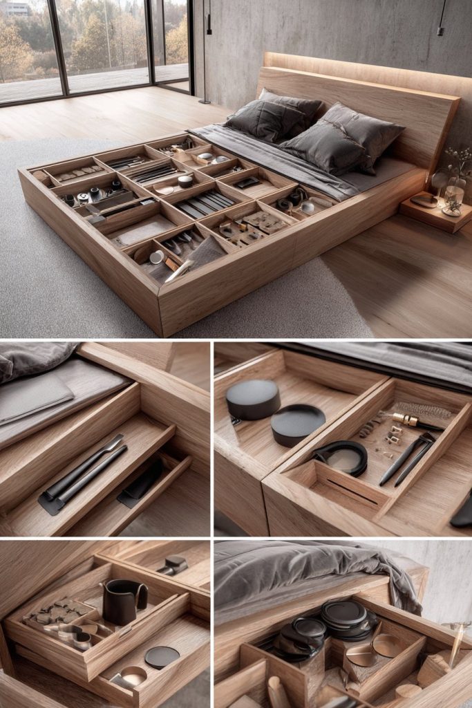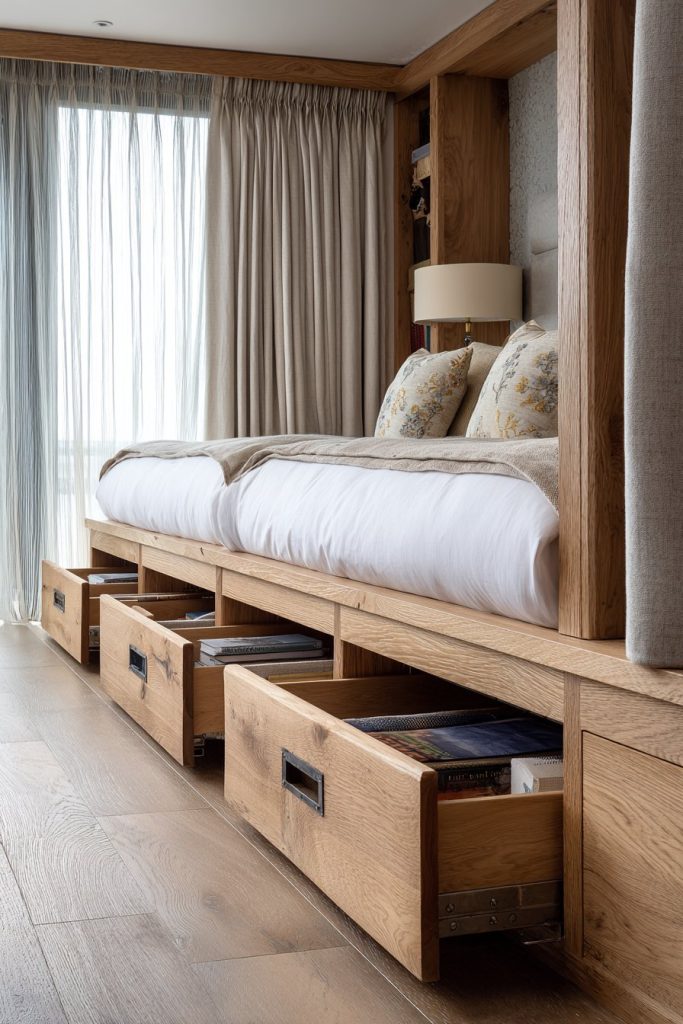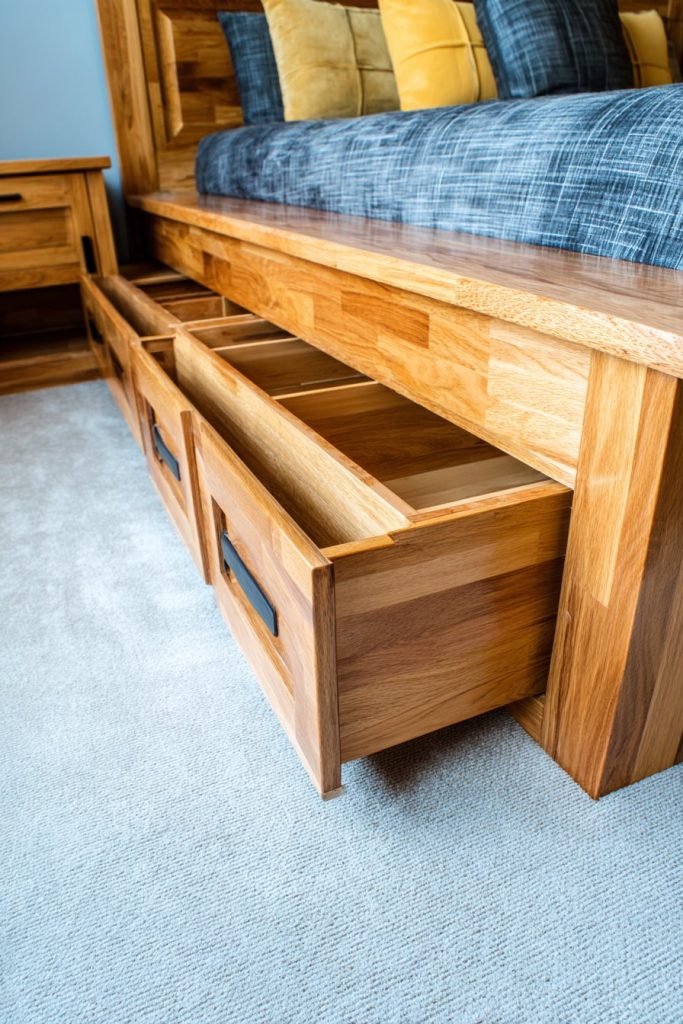 Platform beds with built-in storage drawers represent efficient use of bedroom real estate by incorporating storage directly into essential furniture pieces. These streamlined designs feature smooth-operating drawer hardware and internal dividers that maintain organization within storage compartments. Natural oak construction with visible grain patterns adds warmth and character to clean-lined contemporary designs.