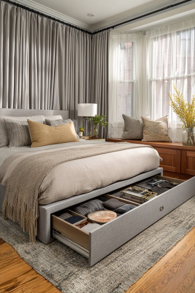 The fabric-lined compartments within these drawer systems protect delicate items while maintaining organization. Morning light filtering through bedroom windows highlights the discretion of these storage solutions, which remain virtually invisible during daily use yet provide substantial storage capacity. The smooth-gliding mechanism ensures easy access to stored items, making this solution practical for everyday use rather than merely seasonal storage.