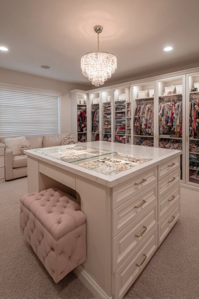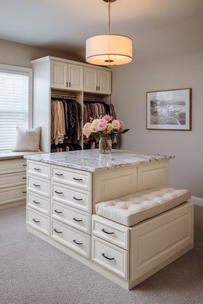 The central island design creates natural traffic flow patterns within walk-in closet spaces while providing a focal point for the storage environment. Soft overhead lighting illuminates the luxury storage features while creating sophisticated ambiance appropriate for personal dressing spaces. The combination of storage and seating functionality transforms closets into personal dressing rooms.