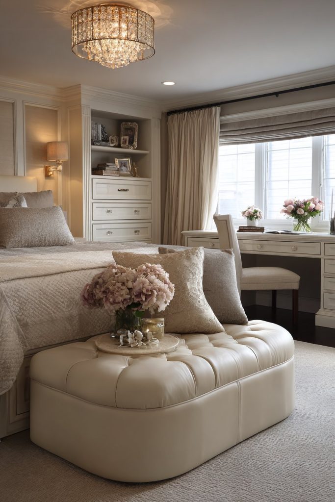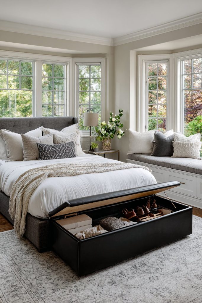 Built-in side storage cubbies extend the functionality of these pieces, providing organized spaces for shoes, accessories, or daily-use items. The neutral color palettes and sophisticated upholstery choices ensure these functional pieces contribute positively to bedroom aesthetics rather than appearing purely utilitarian. Natural light streaming through large windows highlights the quality construction and attention to detail in these furniture pieces.