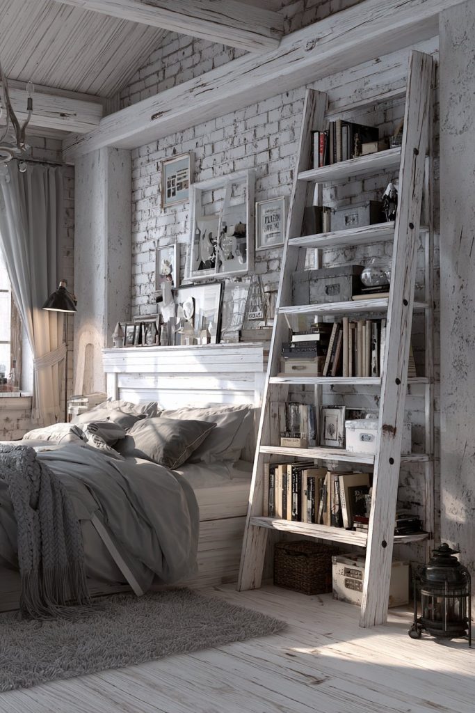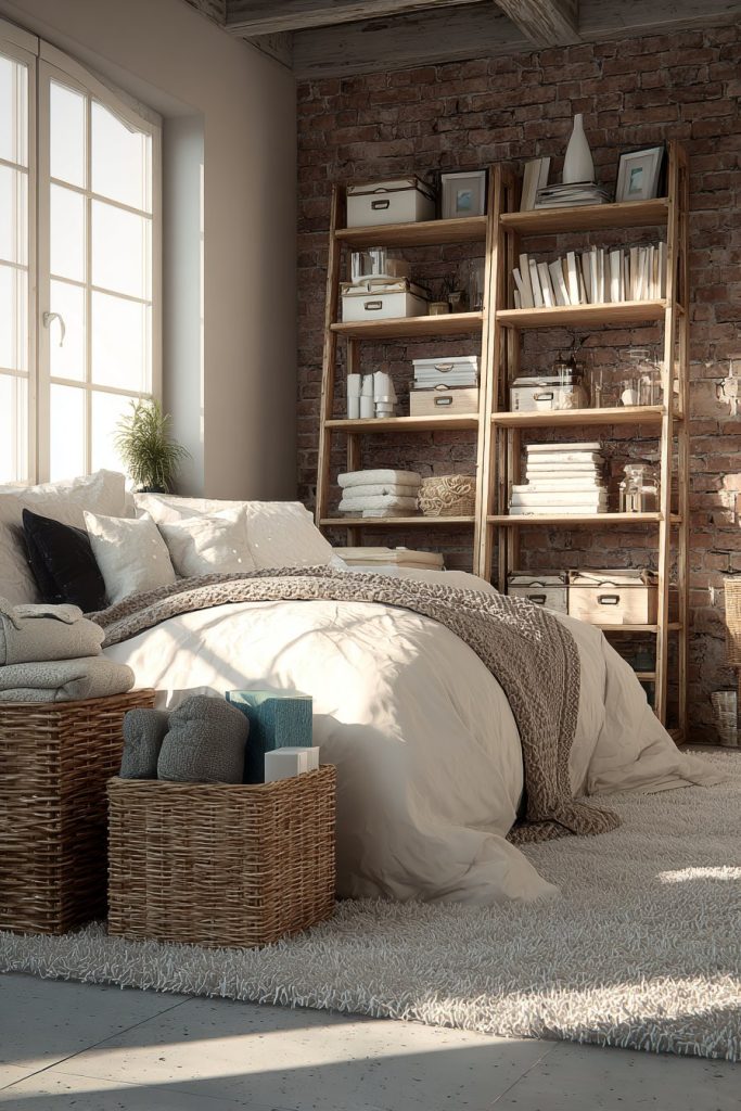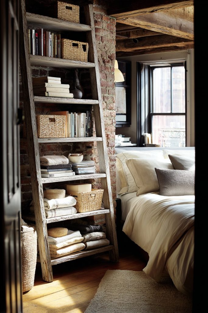 Vertical storage solutions offer dramatic impact while occupying minimal floor space, making them ideal for bedrooms with architectural character. Tall ladder-style bookshelves constructed from whitewashed wood create striking focal points while providing substantial storage capacity. These units work particularly well in loft-style bedrooms with exposed brick walls, where the contrast between refined wood and raw masonry creates compelling visual tension.