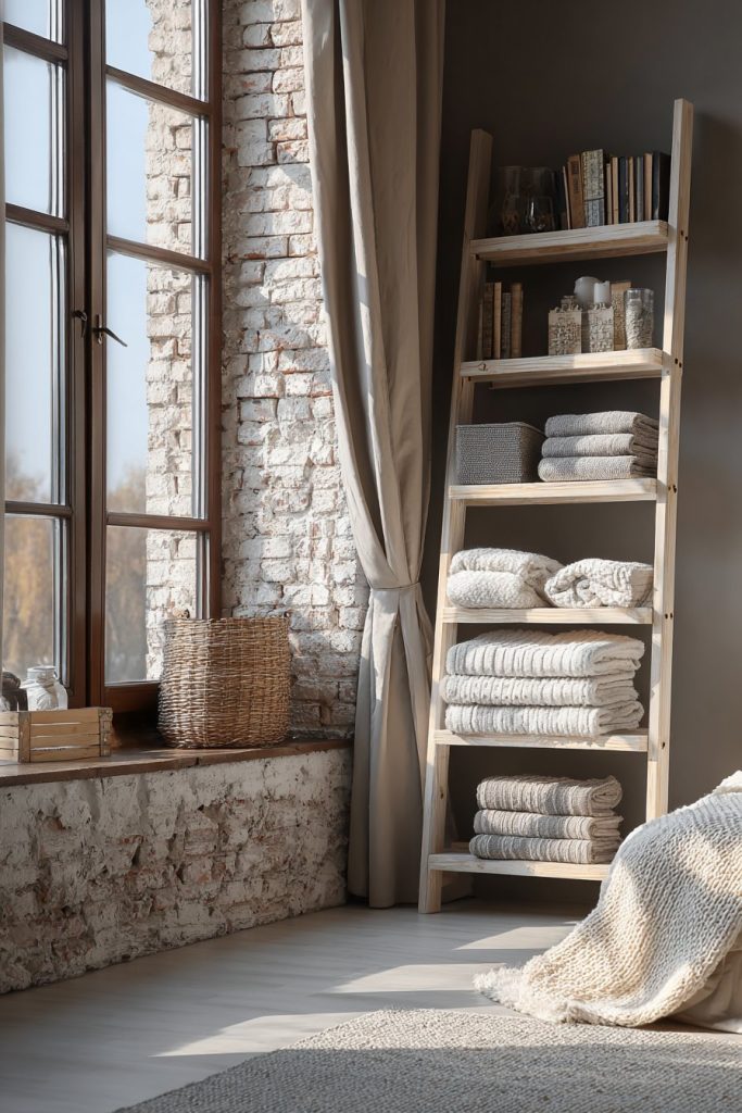 The open design of ladder shelving allows for creative display opportunities, accommodating books, decorative storage boxes, and carefully folded textiles. Natural lighting plays across the varied heights and depths of stored items, creating interesting shadow patterns that change throughout the day. The vertical emphasis of these storage units draws the eye upward, creating an impression of increased ceiling height and overall spaciousness.