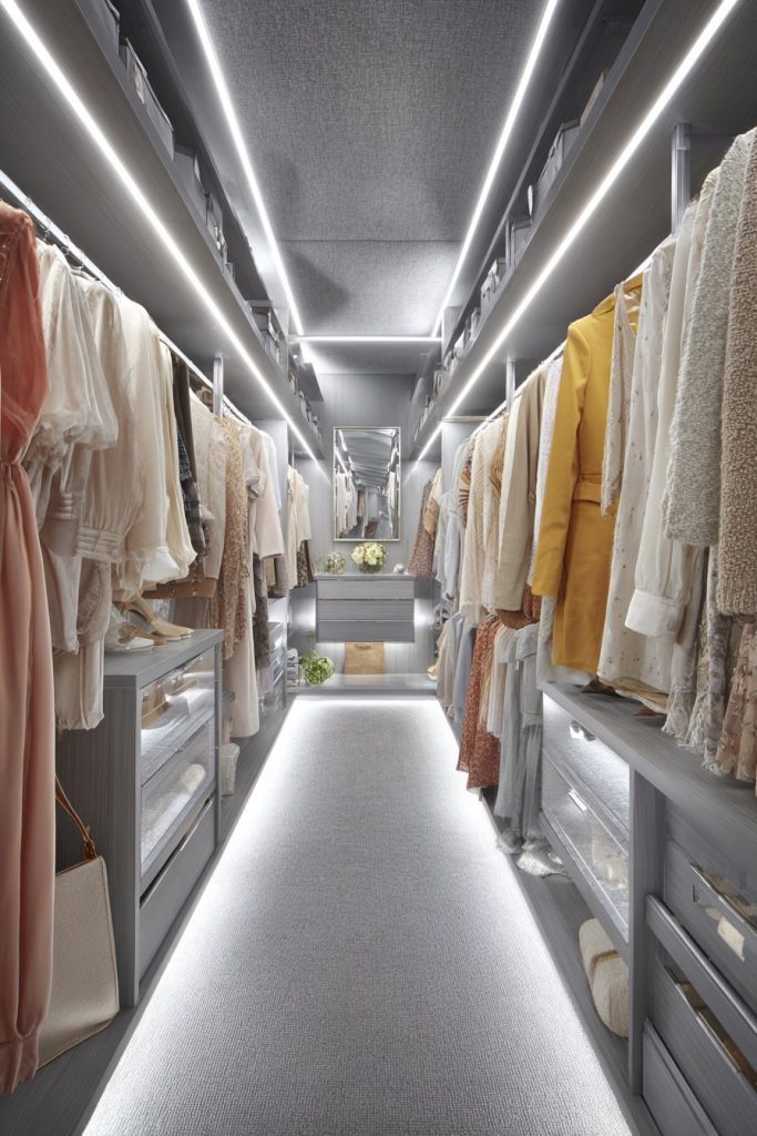 Soft grey carpeting underfoot adds comfort during dressing routines, while warm white LED lighting throughout ensures accurate color representation when selecting clothing. The clear acrylic drawer systems allow easy identification of accessories, jewelry, and small items without requiring label systems. Each storage zone serves specific functions, from hanging formal wear to organizing seasonal accessories.