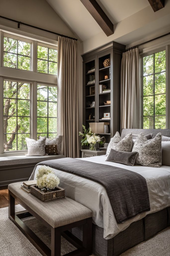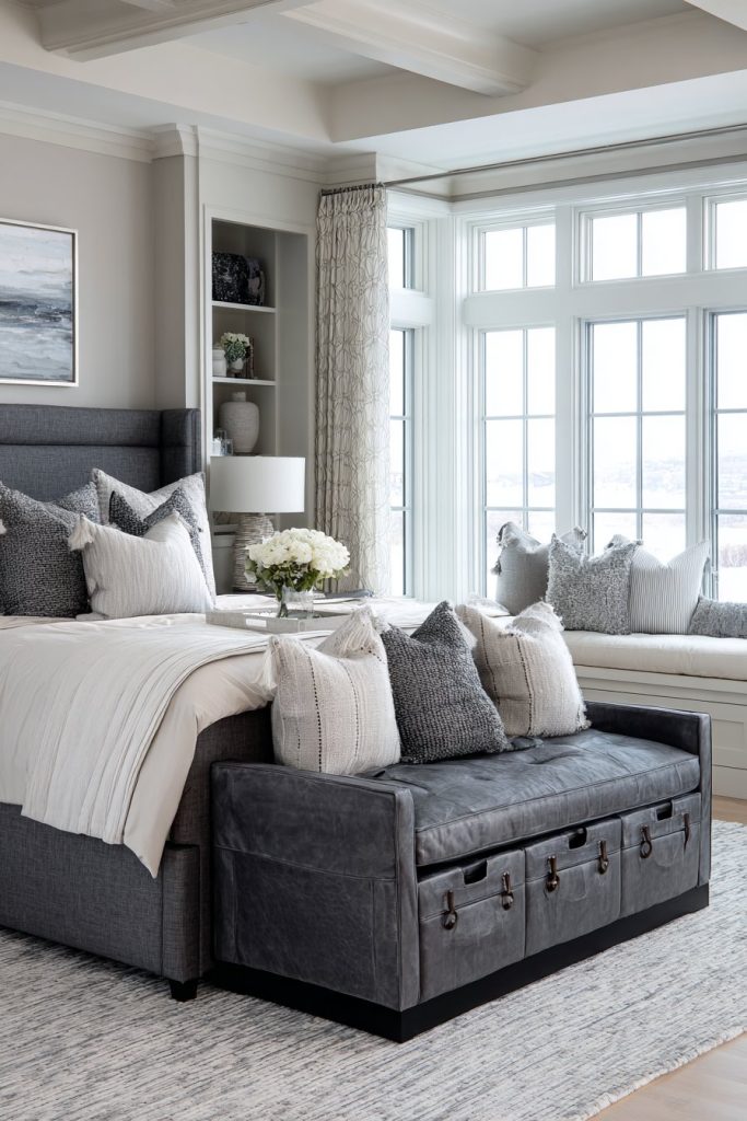 Storage benches positioned at the foot of beds represent perfect examples of dual-purpose furniture design. These pieces, upholstered in durable fabrics like charcoal linen, provide comfortable seating while concealing substantial storage compartments. The hidden storage compartments accommodate bulky items like extra bedding, seasonal clothing, or personal items that need to remain easily accessible but out of sight.