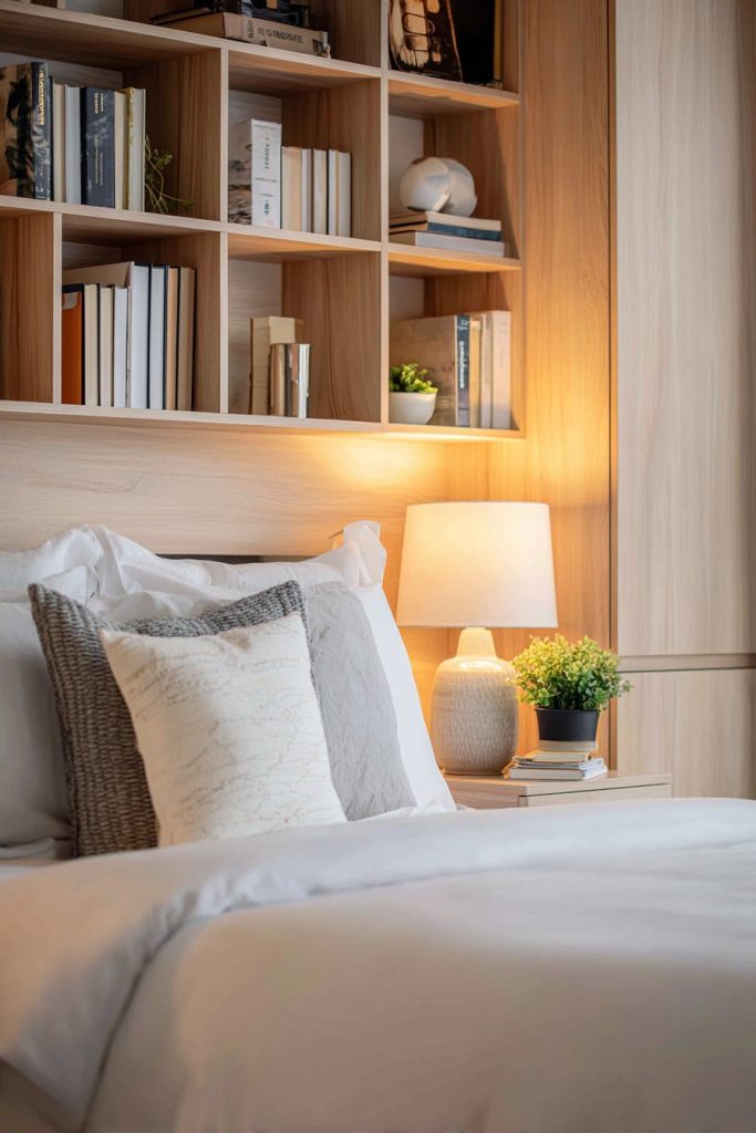 Morning light emphasizes the sophisticated storage integration, revealing the careful attention to detail in custom headboard construction. The balance between visible design elements and hidden functionality creates bedroom focal points that serve both aesthetic and practical purposes.