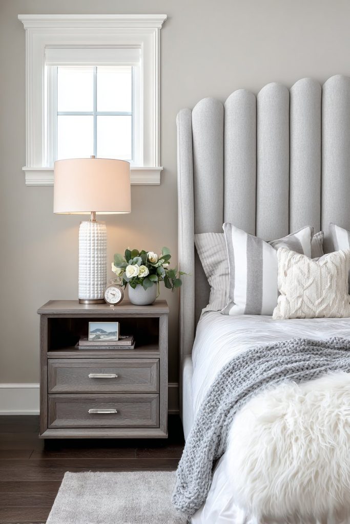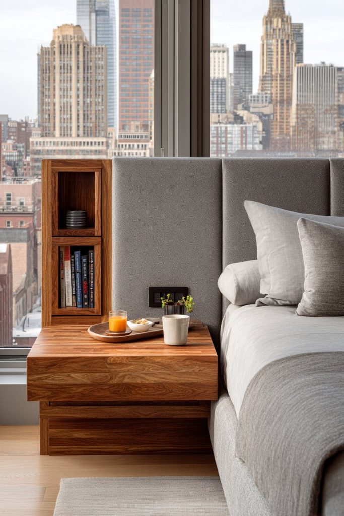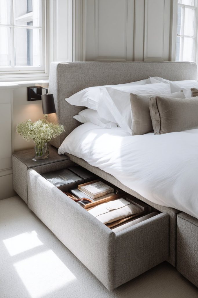 Headboard designs that incorporate hidden storage represent sophisticated approaches to bedroom organization. Custom headboards with integrated nightstand compartments and concealed drawers maximize functionality while maintaining clean aesthetic lines. Upholstered surfaces in soft grey fabrics provide comfort for reading in bed while hiding practical storage solutions behind elegant design.