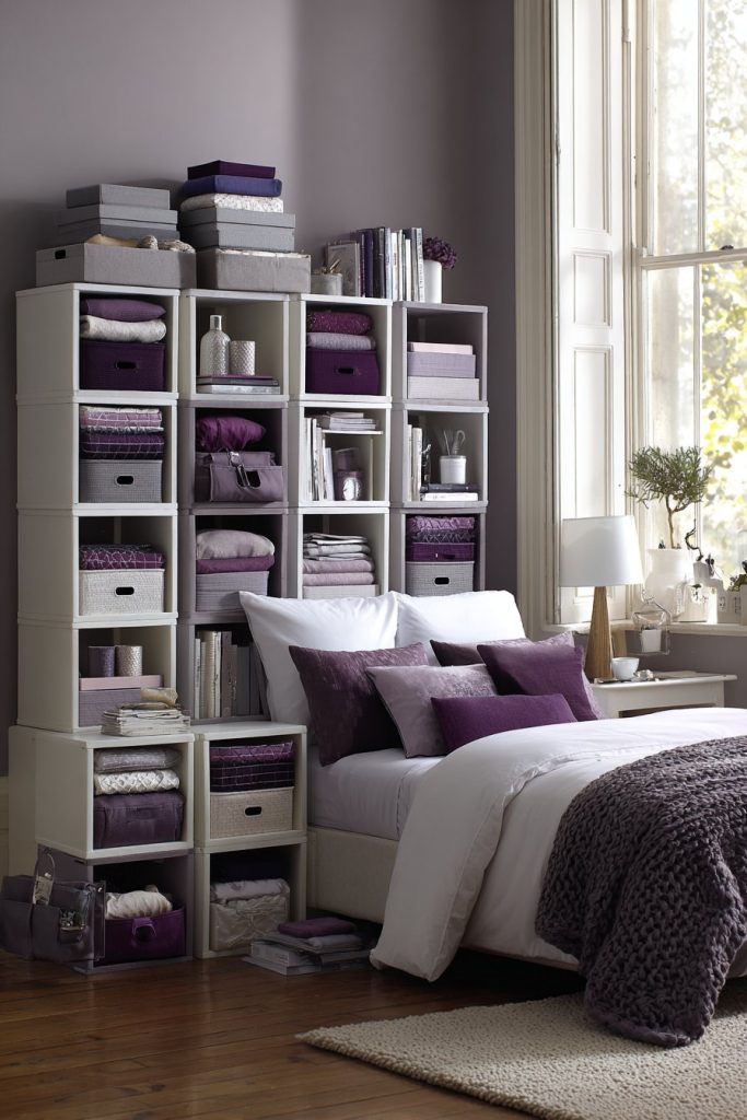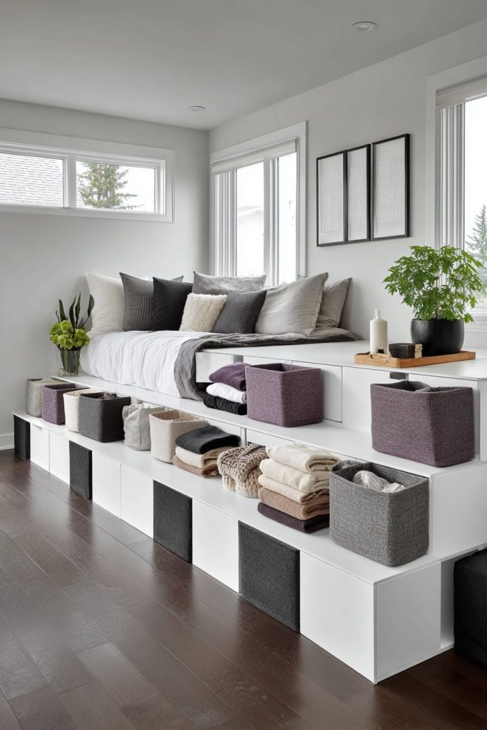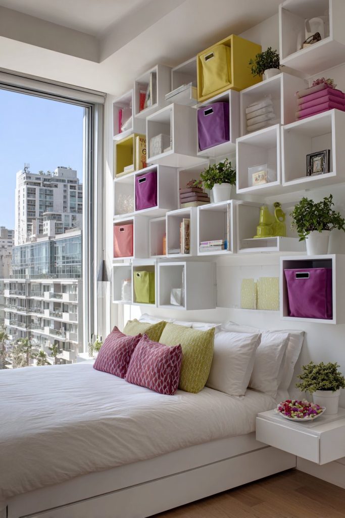 Modular storage systems offer unparalleled flexibility for changing storage needs and room configurations. White laminate cube units arranged along bedroom walls create clean, contemporary storage solutions that can be reconfigured as needed. The inclusion of coordinating fabric bins adds color and softness while concealing stored items for clean visual lines.