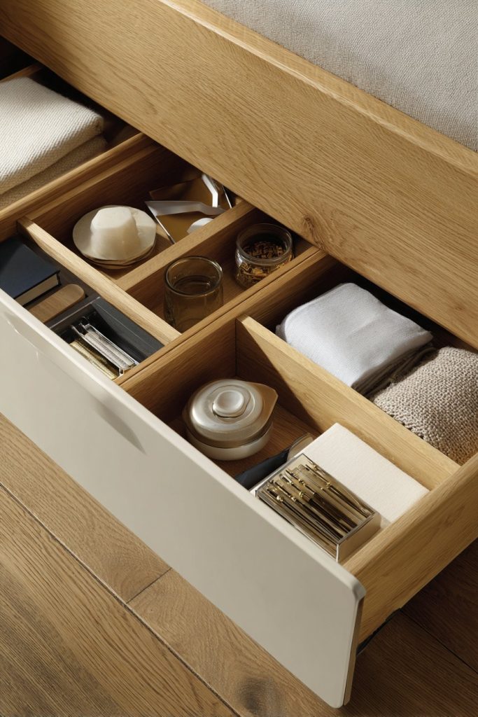 The integration of under-bed storage allows bedrooms to maintain their serene, uncluttered appearance while providing practical solutions for bedding, out-of-season clothing, and personal items. Natural oak flooring and neutral linen bedding complement these storage systems, creating cohesive bedroom environments that feel both spacious and well-organized.