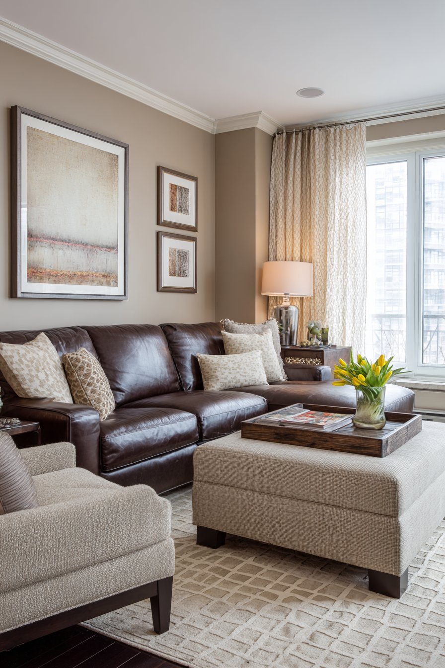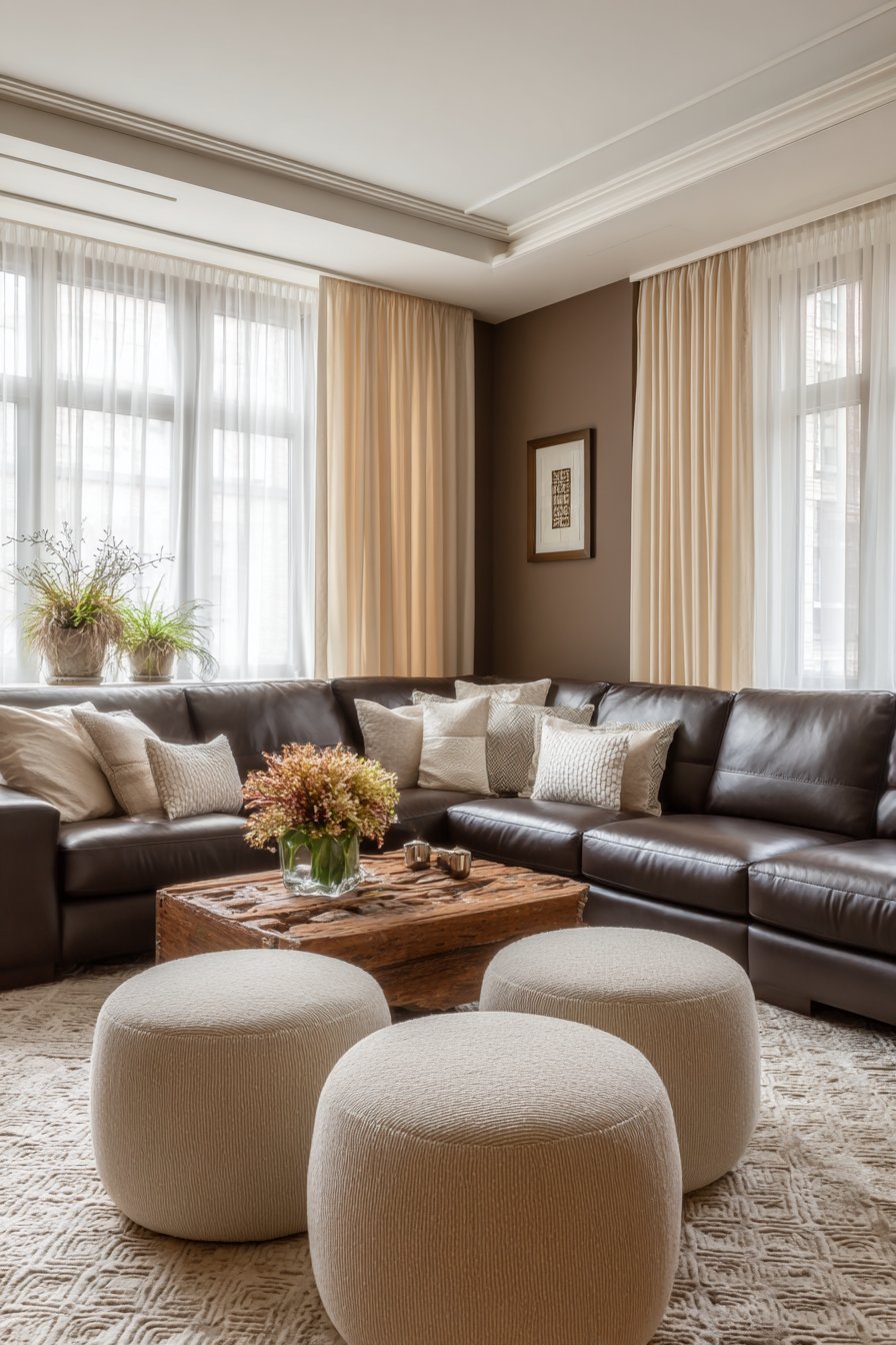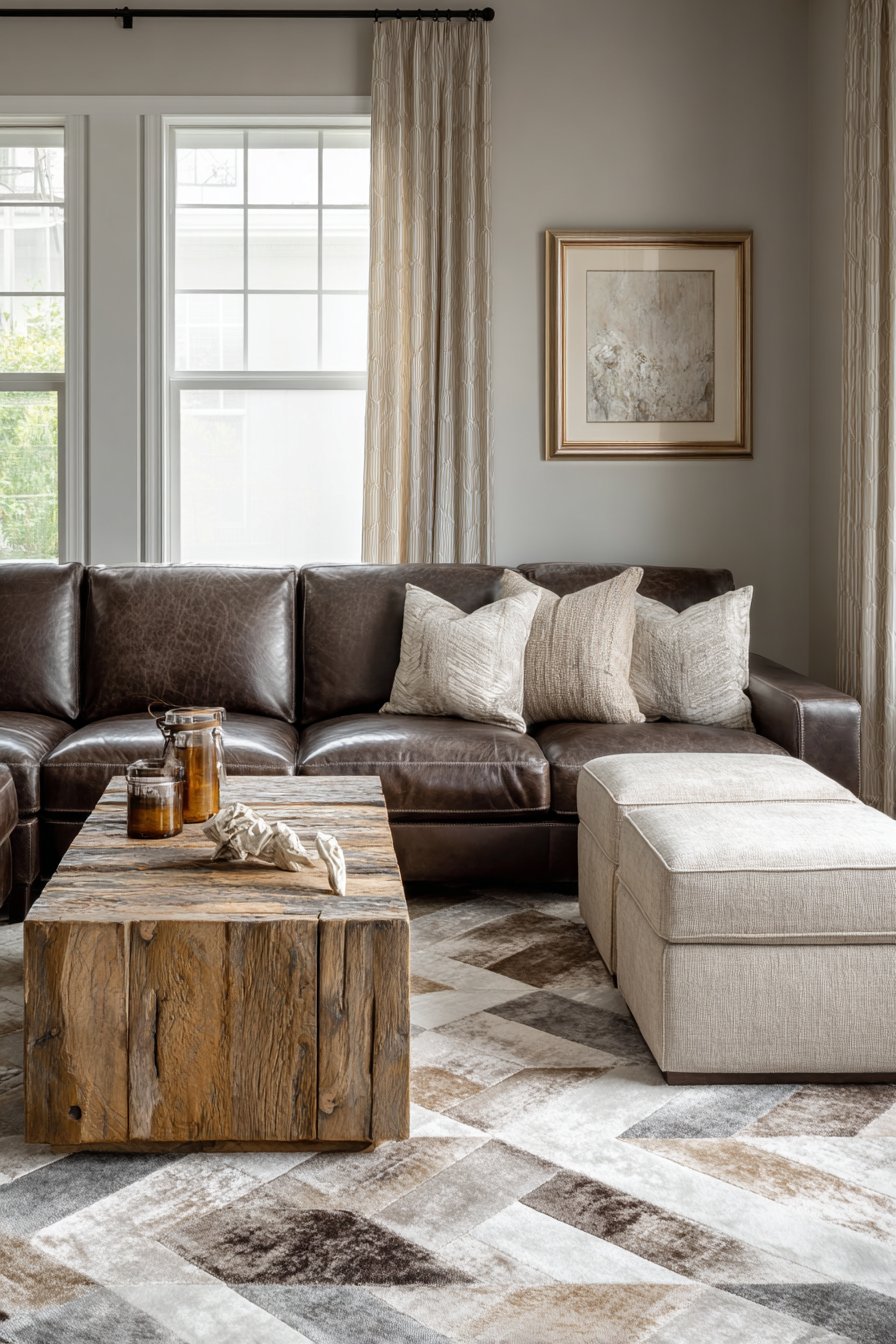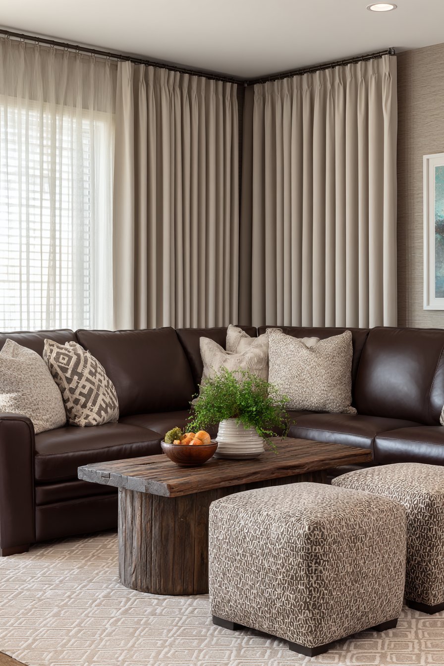 Key Design Tips: Invest in full-grain chocolate brown leather for sectional seating that develops beautiful patina and character over time. Choose reclaimed wood furniture to add authenticity, texture, and environmental consciousness to your design. Incorporate beige performance fabric ottomans for versatile functionality and lighter tonal balance. Select geometric rugs in sand and taupe tones to add subtle pattern while maintaining the neutral palette. Use sheer beige window treatments to filter natural light softly while preserving privacy. Position the sectional to maximize natural light exposure, which enhances leather’s rich tones and highlights wood grain.