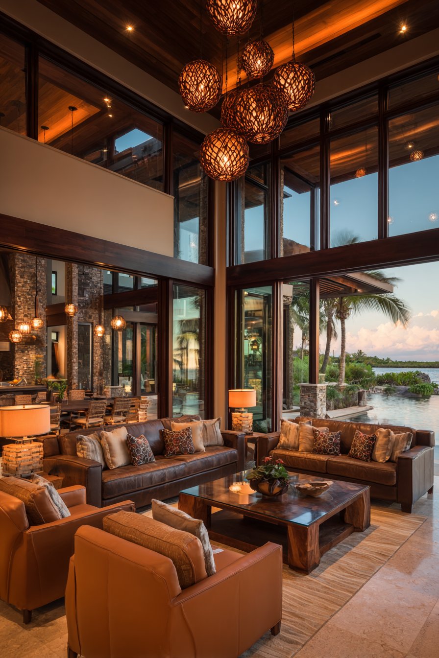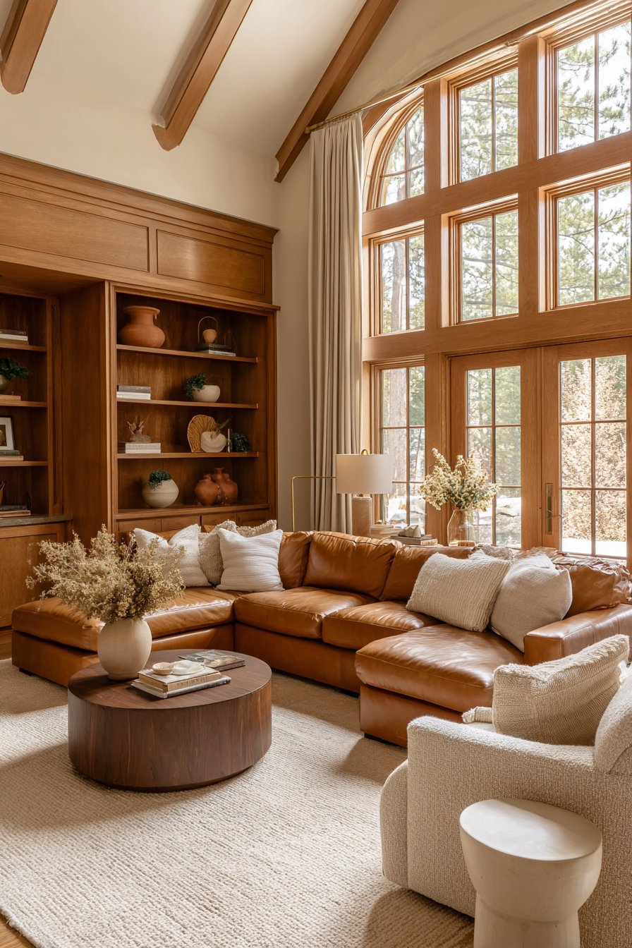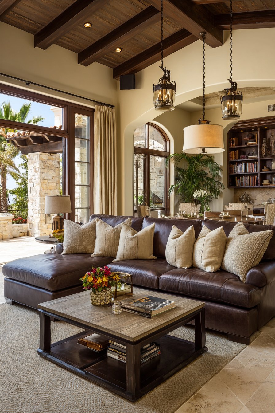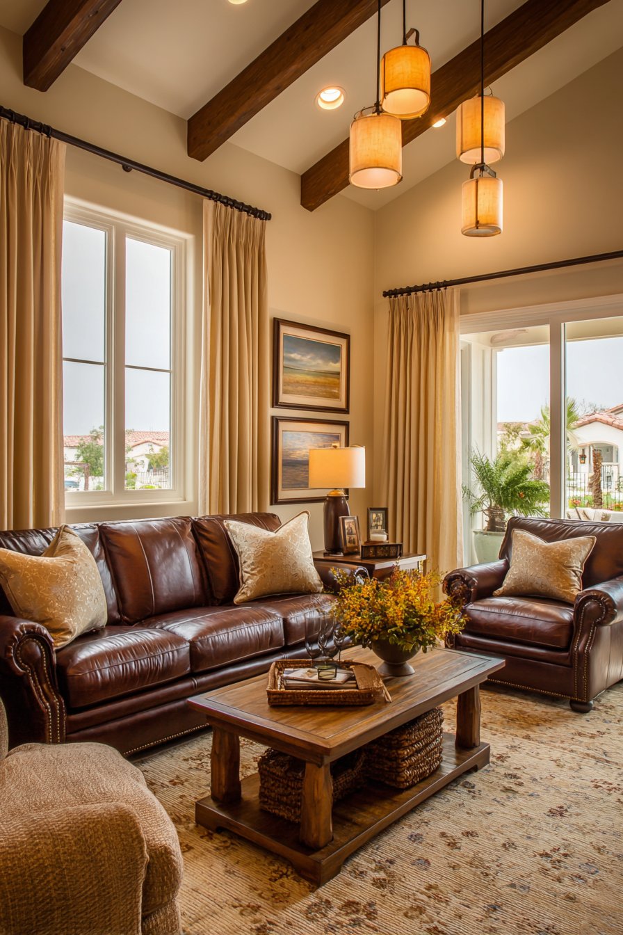 Key Design Tips: Invest in full-grain chocolate brown leather for sectional seating that develops beautiful patina and character over time. Choose reclaimed wood furniture to add authenticity, texture, and environmental consciousness to your design. Incorporate beige performance fabric ottomans for versatile functionality and lighter tonal balance. Select geometric rugs in sand and taupe tones to add subtle pattern while maintaining the neutral palette. Use sheer beige window treatments to filter natural light softly while preserving privacy. Position the sectional to maximize natural light exposure, which enhances leather’s rich tones and highlights wood grain.