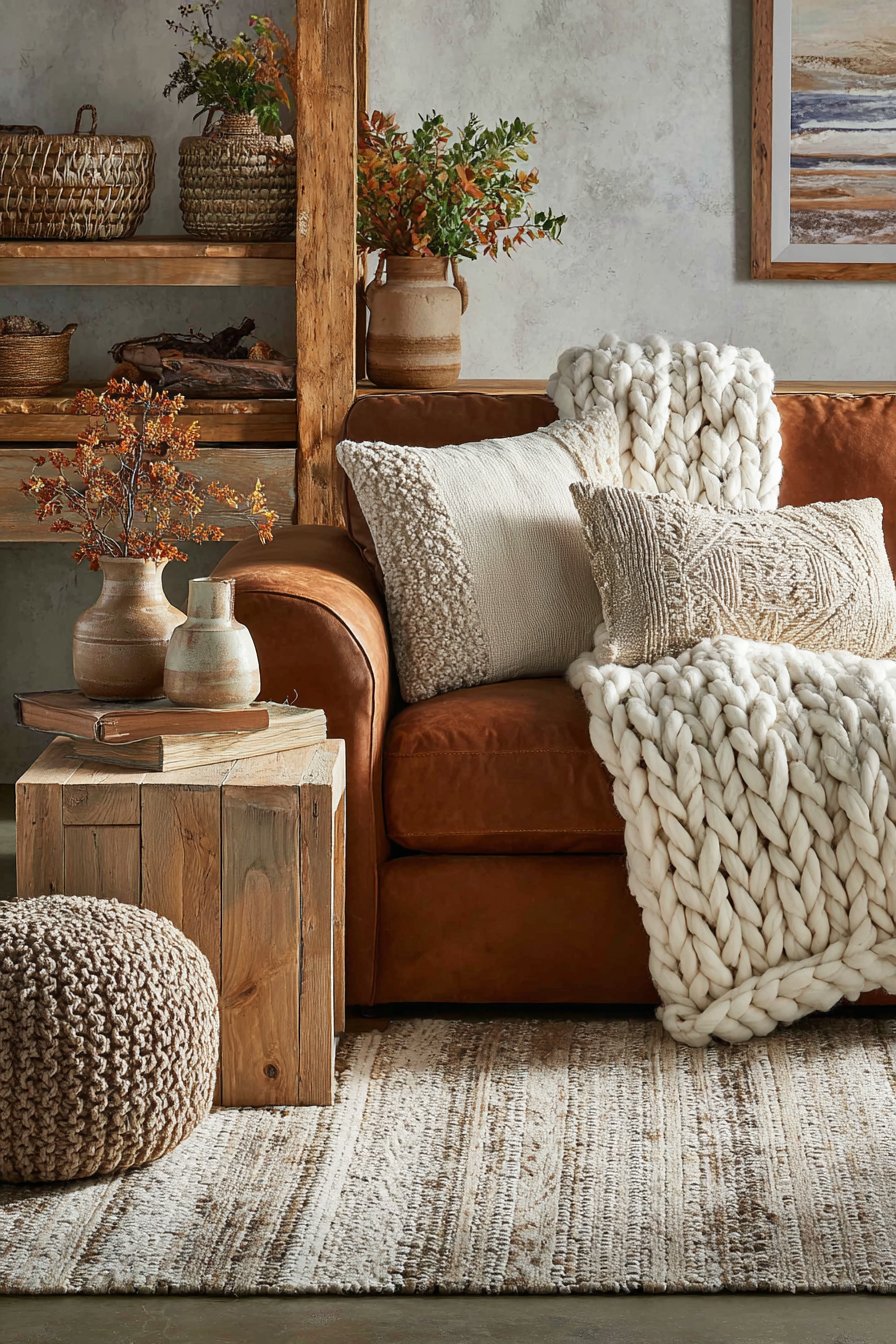 Chunky knit throws in oatmeal introduce substantial texture and cozy comfort, their handcrafted appearance and visible stitching adding artisanal quality. The thick, irregular knit creates three-dimensional texture that invites touch and provides actual warmth during cooler months. These throws drape casually over sectional arms or fold across seat backs, their neutral cream tone bridging the brown leather and beige upholstery beautifully. Velvet cushions in cognac add luxurious softness and visual weight, their dense pile and slight sheen catching light differently than surrounding materials.