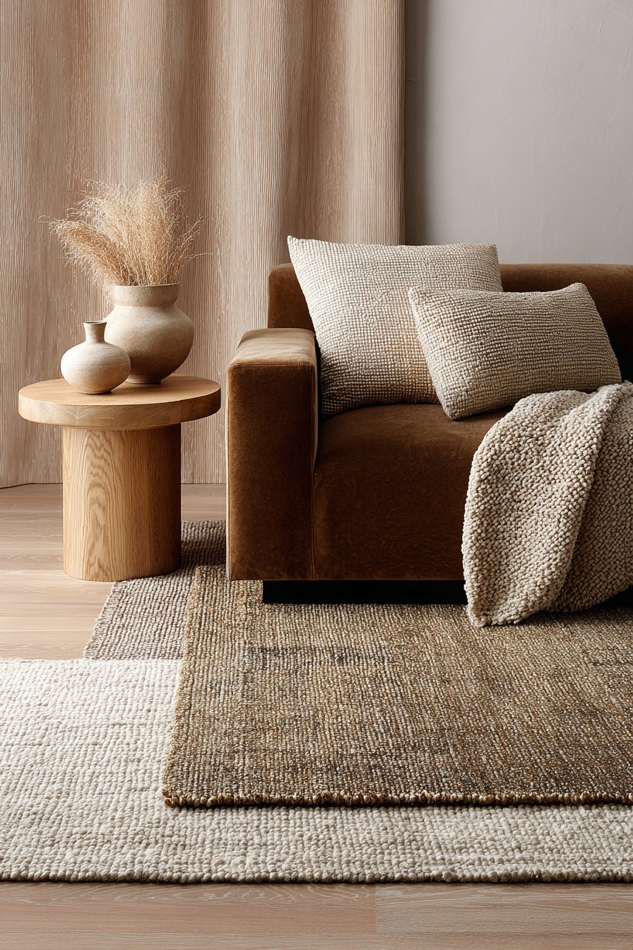 Key Design Tips: Invest in velvet upholstery in rich cognac or caramel tones for a luxurious tactile experience that adds depth to your brown palette. Use oversized cushions in beige linen to create comfortable, inviting seating while maintaining the neutral color scheme. Layer area rugs in different textures—start with jute for foundation, then add wool or cotton in complementary beiges and taupes. Display handmade ceramic vessels in earth tones as sculptural elements that add personality without color distraction. Choose natural oak furniture for its warm honey tones that bridge brown and beige beautifully. Incorporate chunky knit throws in oatmeal or cream for textural interest and cozy comfort.