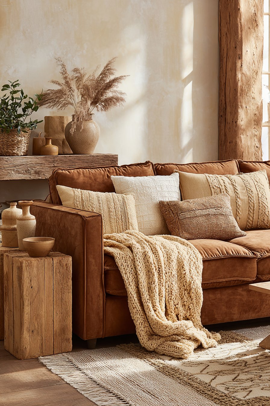 The foundation of this inviting living room centers on a plush velvet sofa in a rich cognac brown that immediately establishes a sense of luxury and comfort. The deep pile of the velvet catches light in varying ways throughout the day, creating subtle shifts in color intensity that keep the eye engaged. Oversized beige linen cushions in generous proportions provide both comfort and visual balance, their matte finish contrasting beautifully with the sheen of the velvet. A chunky knit throw in oatmeal drapes casually over one arm, its handcrafted texture adding an element of coziness that invites you to curl up and relax.