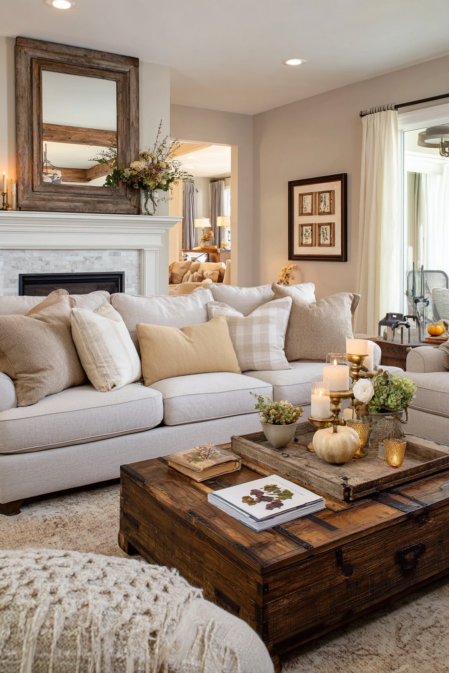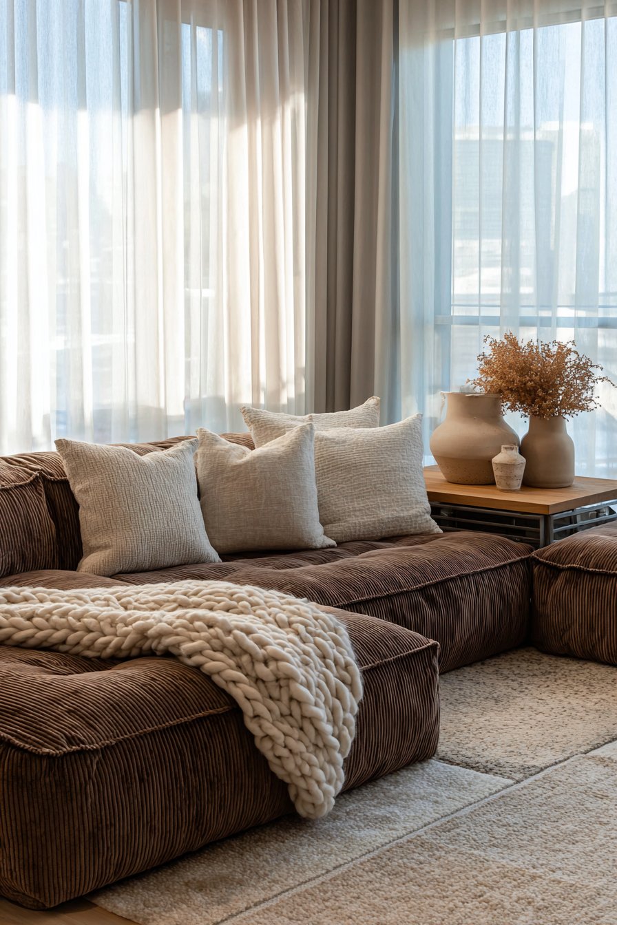 Key Design Tips: Start with performance fabric upholstery in beige as a durable, neutral foundation for layering. Add leather pillows in brown tones for refined richness and smooth textural contrast. Incorporate chunky knit throws in oatmeal or cream for cozy, artisanal texture and actual warmth. Include velvet cushions in cognac for luxurious pile and light-catching depth. Mix smooth, nubby, and plush textures to create dimensional interest across the seating area. Maintain strict adherence to brown and beige color family while varying textures extensively. Position textiles to catch natural light, which emphasizes surface variations and creates subtle shadows. Allow casual draping rather than overly styled arrangements for approachable comfort. Change textile layers seasonally—lighter linens in summer, heavier knits in winter. Choose machine-washable options where possible for practical maintenance.