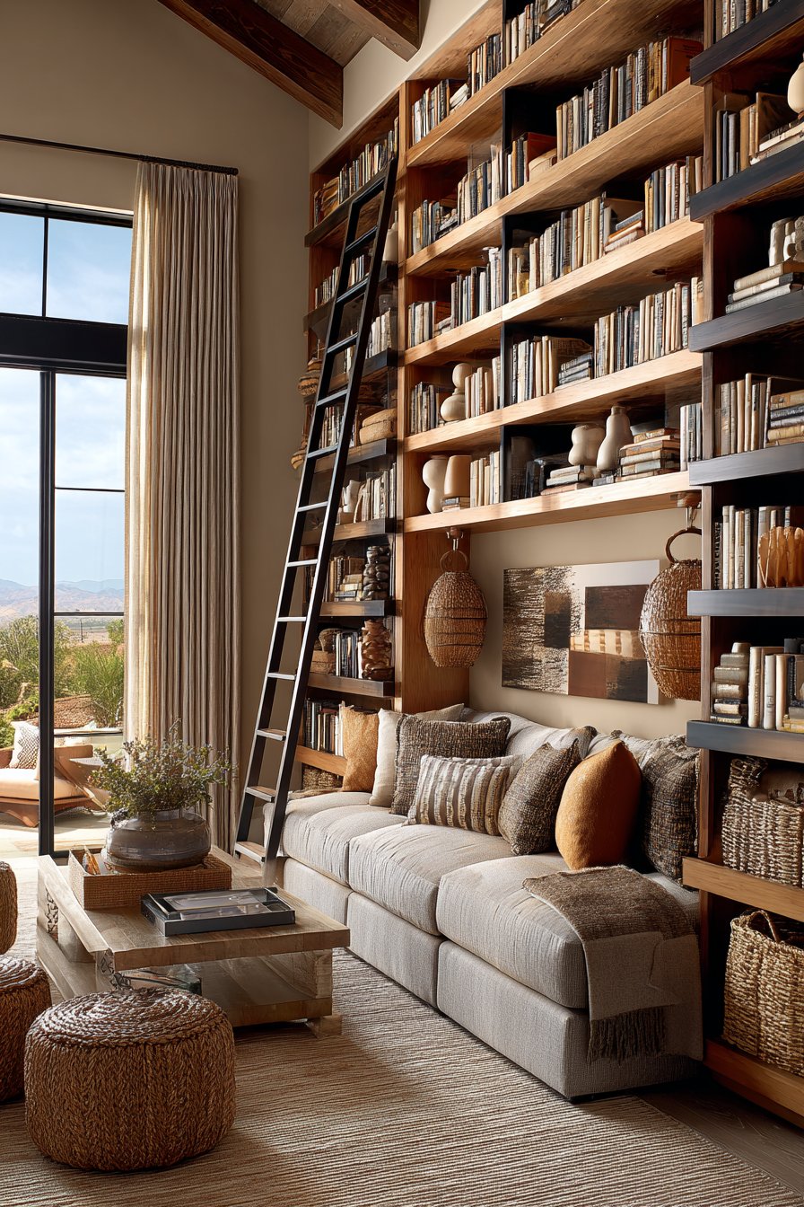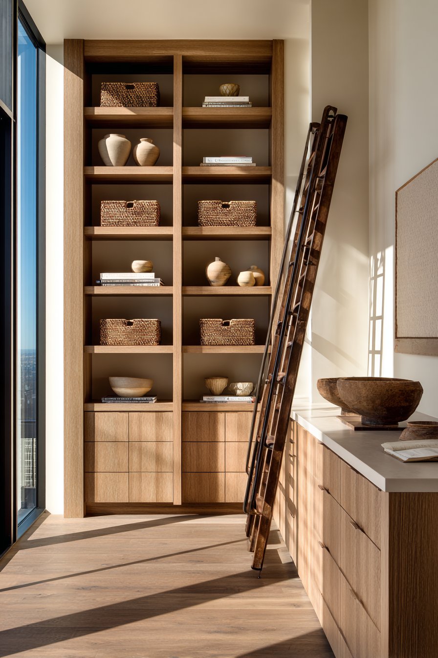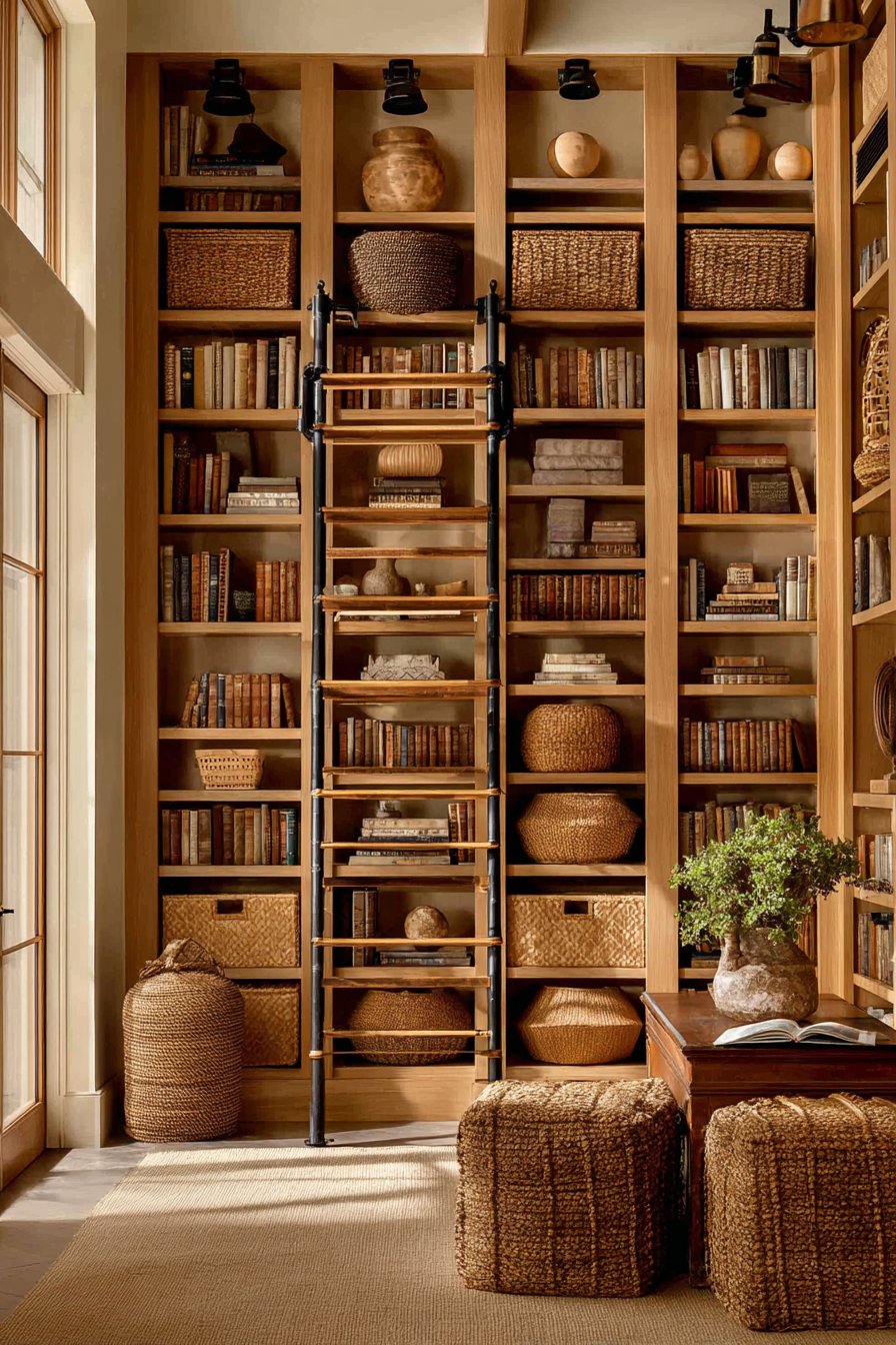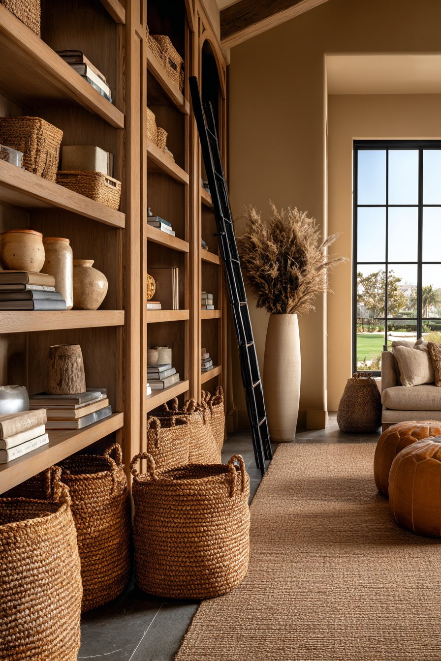 Key Design Tips: Install floor-to-ceiling bookcases in honey-toned wood to create extensive storage with warm, glowing presence. Use adjustable shelving to accommodate various book sizes and allow future flexibility. Mix vertical and horizontal book arrangements to create visual variety and accommodate different book dimensions. Display beige ceramics between books to provide visual breathing room and add decorative interest. Incorporate woven baskets on lower shelves for closed storage that maintains the natural material aesthetic. Add a rolling library ladder in bronze or aged metal for functional access and traditional library charm. Paint or finish backing boards in beige or cream to create clean backdrop for displayed items. Ensure proper lighting with sconces or integrated LED strips to make book titles readable and create ambiance.