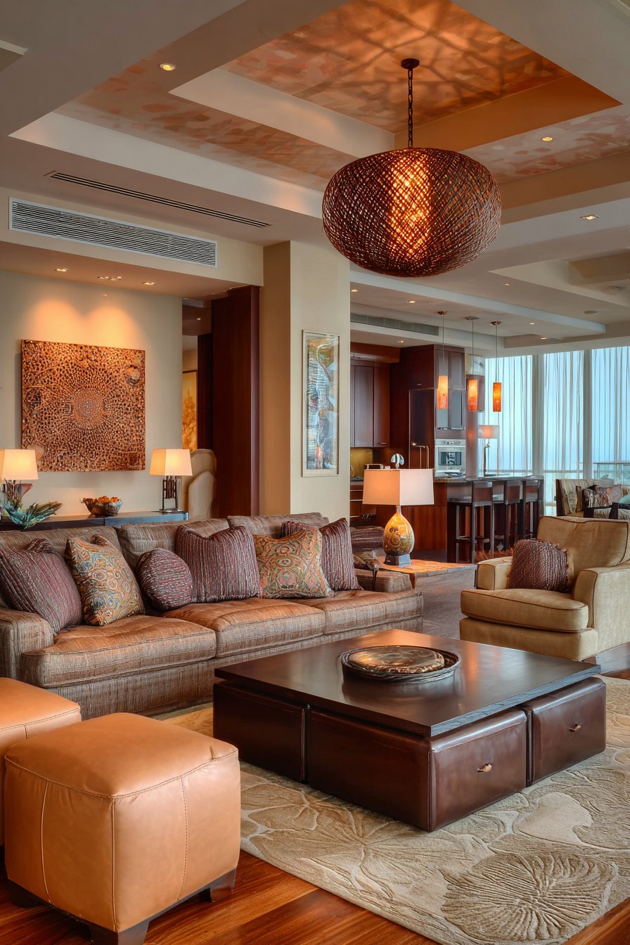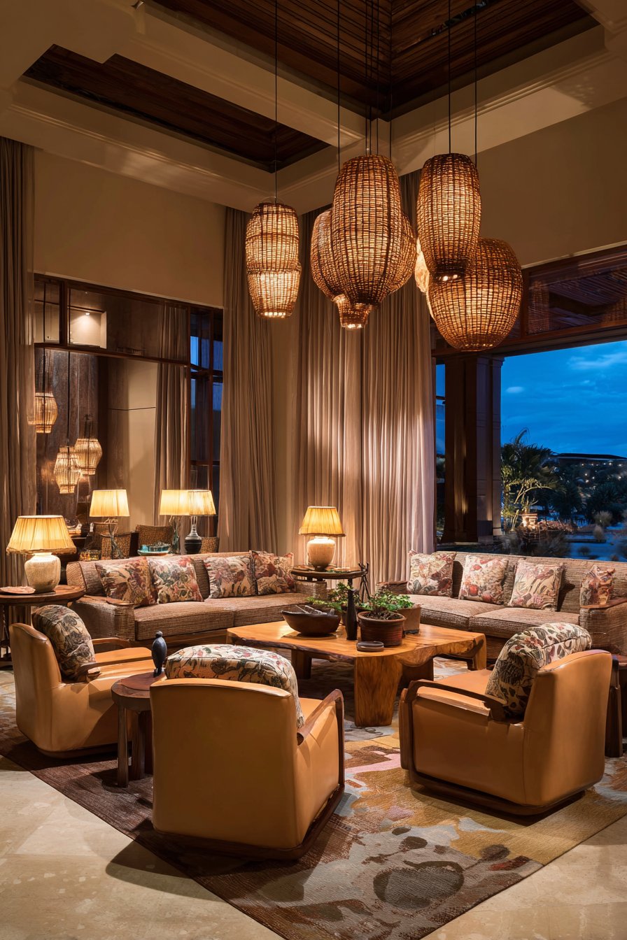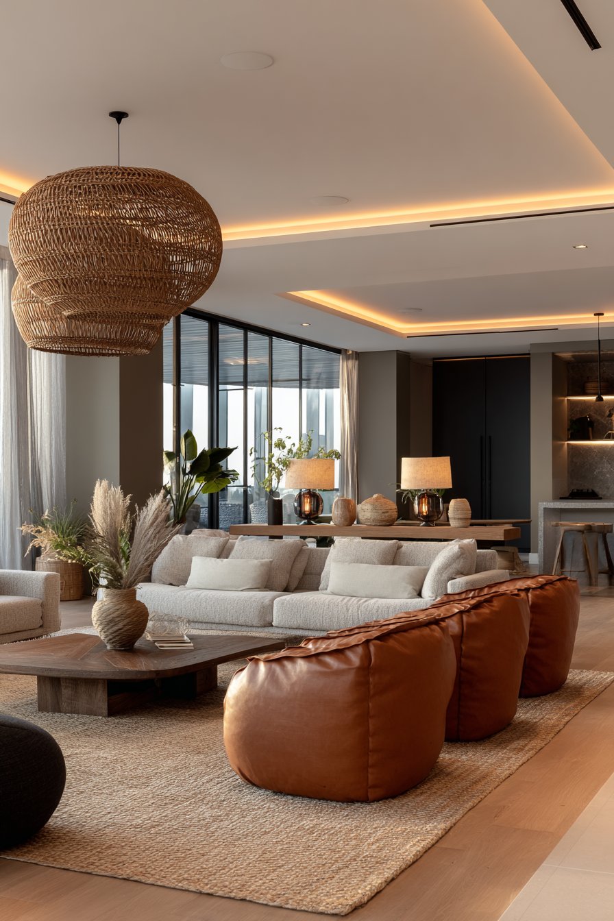 Successful lighting design layers multiple sources to create flexibility and atmosphere, and this living room demonstrates this principle through careful selection and placement. The statement pendant light, constructed from woven rattan in natural brown, hangs from the ceiling as both functional illumination and sculptural artwork. The rattan’s open weave allows light to filter through, creating beautiful shadow patterns on ceiling and walls while the warm brown tone of the natural fiber reinforces the room’s earth-toned palette. The pendant’s organic, handcrafted quality introduces an artisanal element that feels approachable and warm.