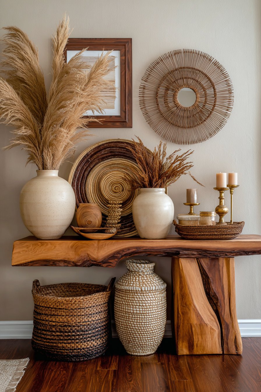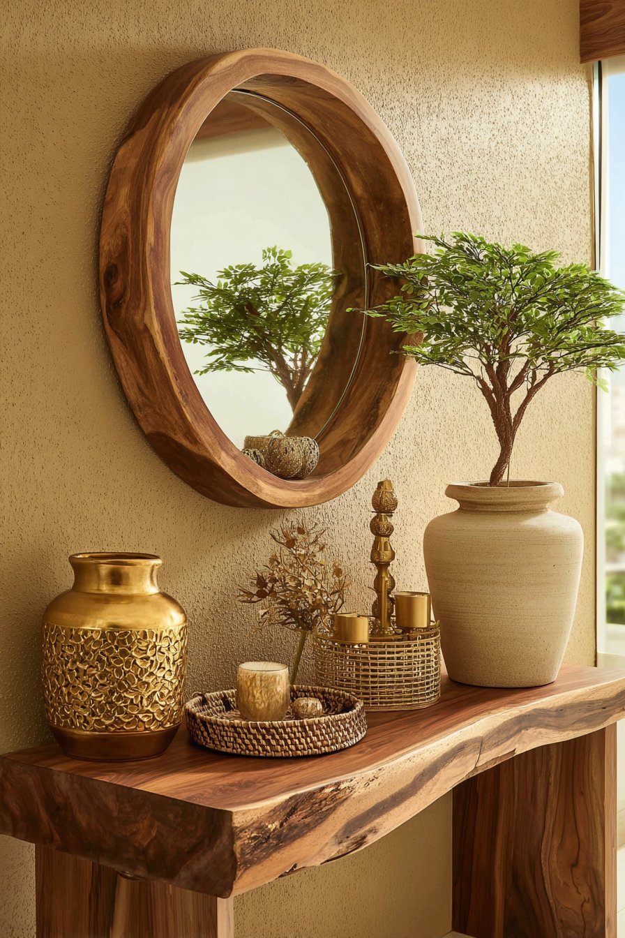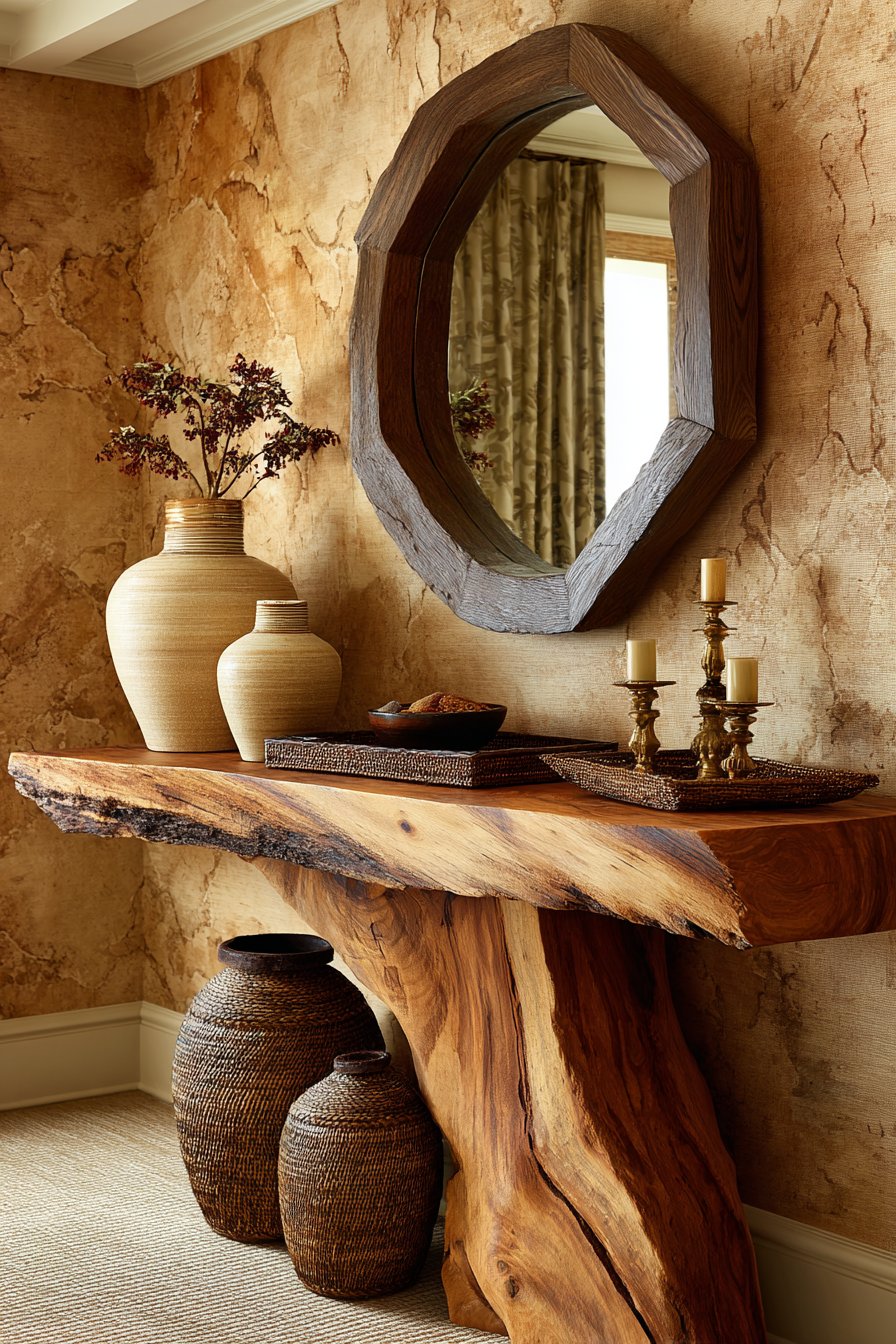 Key Design Tips: Choose live-edge wood furniture in walnut or other dark brown woods to add organic sculptural quality and unique character. Style consoles with odd-numbered groupings of objects in varying heights to create visual interest and rhythm. Display ceramic vases in cream and beige tones to maintain the neutral palette while adding curves and organic forms. Incorporate woven trays in natural brown for corralling smaller objects while adding handcrafted texture. Add brass candlesticks in varying heights for vertical interest and warm metallic accents. Hang mirrors with brown wooden frames above consoles to reflect light and create visual depth. Position consoles near windows where natural sidelight can emphasize displayed textures. Edit ruthlessly—leave adequate negative space around objects to allow each piece to be appreciated. Change seasonal displays to keep the vignette fresh and interesting throughout the year.