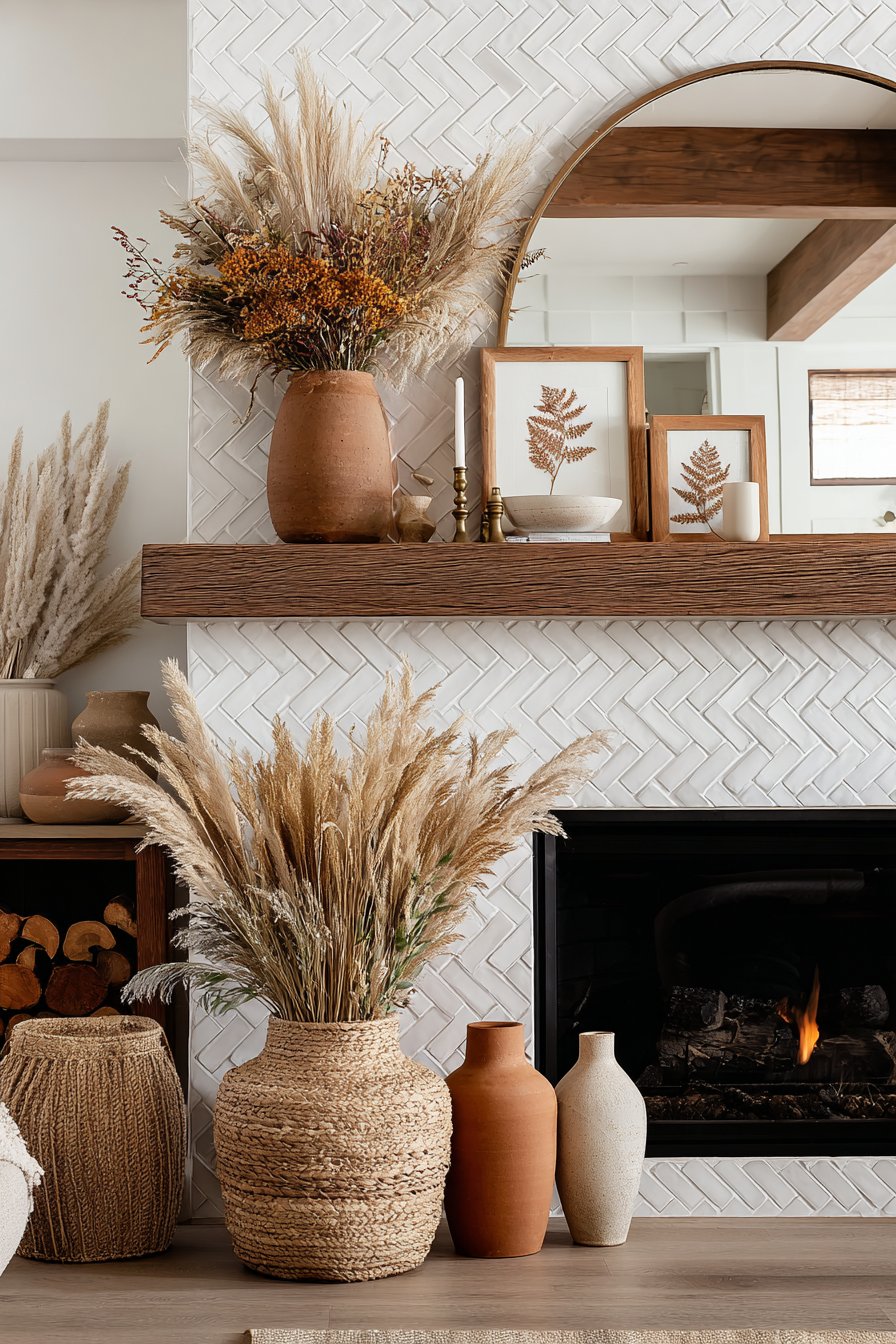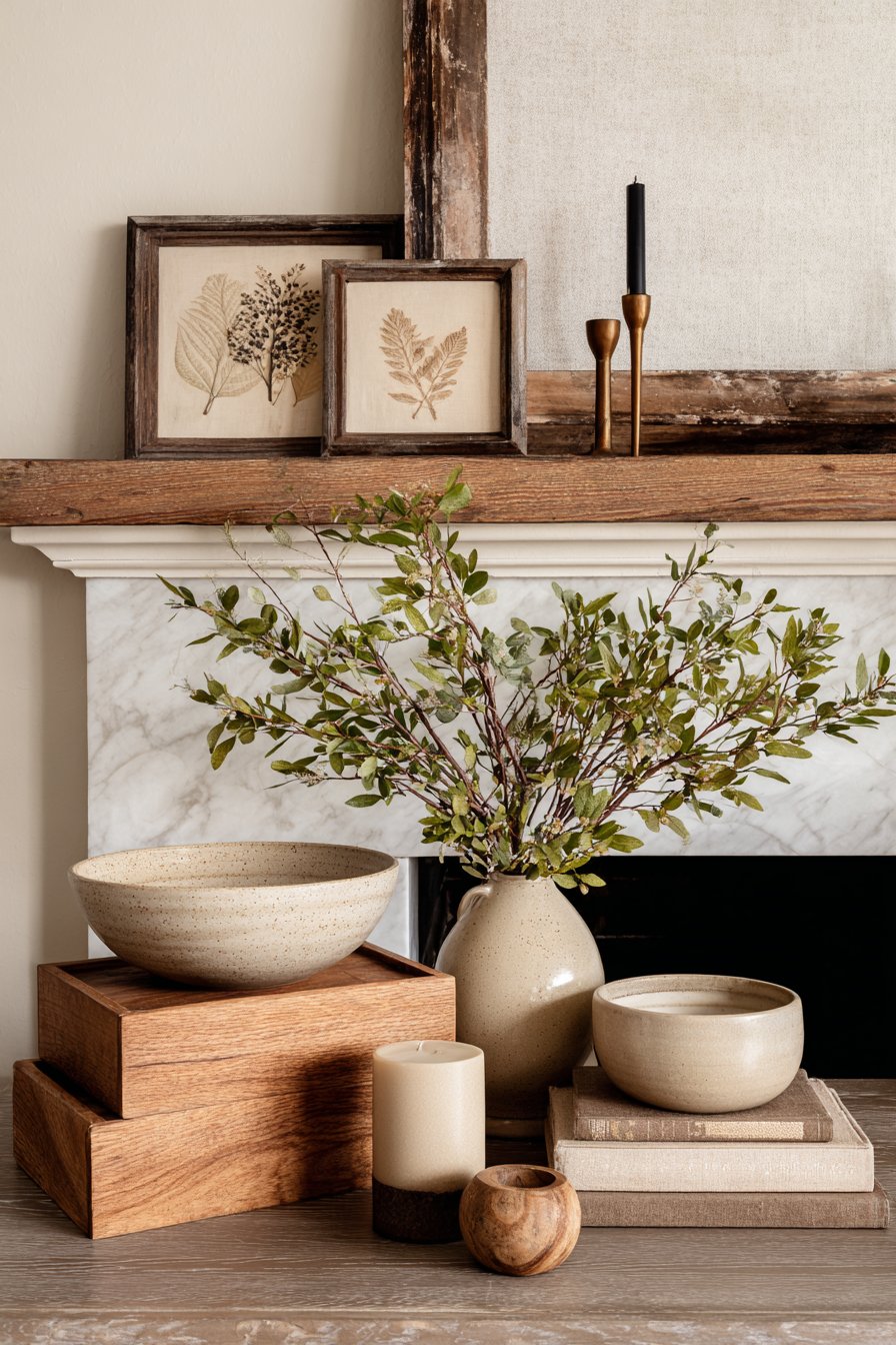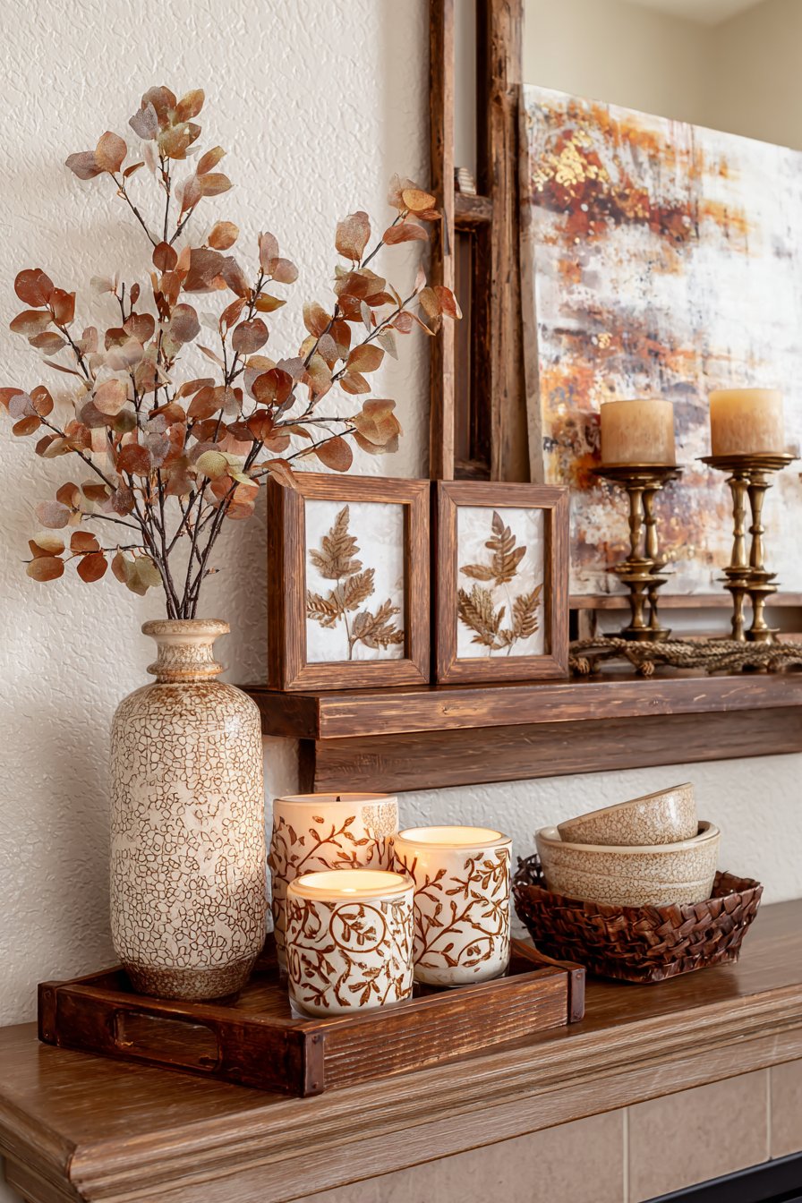 Key Design Tips: Choose live-edge wood furniture in walnut or other dark brown woods to add organic sculptural quality and unique character. Style consoles with odd-numbered groupings of objects in varying heights to create visual interest and rhythm. Display ceramic vases in cream and beige tones to maintain the neutral palette while adding curves and organic forms. Incorporate woven trays in natural brown for corralling smaller objects while adding handcrafted texture. Add brass candlesticks in varying heights for vertical interest and warm metallic accents. Hang mirrors with brown wooden frames above consoles to reflect light and create visual depth. Position consoles near windows where natural sidelight can emphasize displayed textures. Edit ruthlessly—leave adequate negative space around objects to allow each piece to be appreciated. Change seasonal displays to keep the vignette fresh and interesting throughout the year.