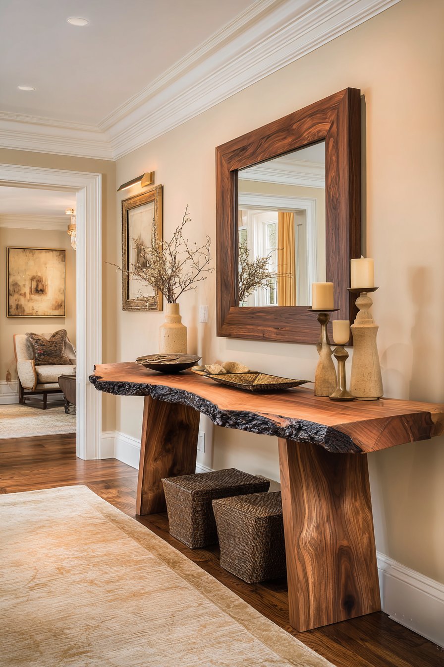 Console tables provide opportunities for creative styling that can transform a functional piece into an artistic vignette. This live-edge walnut console, with its natural edge preserved and beautiful grain patterns visible, serves as both furniture and sculpture. Positioned against a beige painted wall, the deep brown wood creates striking contrast while its organic form softens the geometric lines of the room. The live edge—where the natural contour of the tree remains visible—adds authenticity and connection to nature, making each piece truly one-of-a-kind.