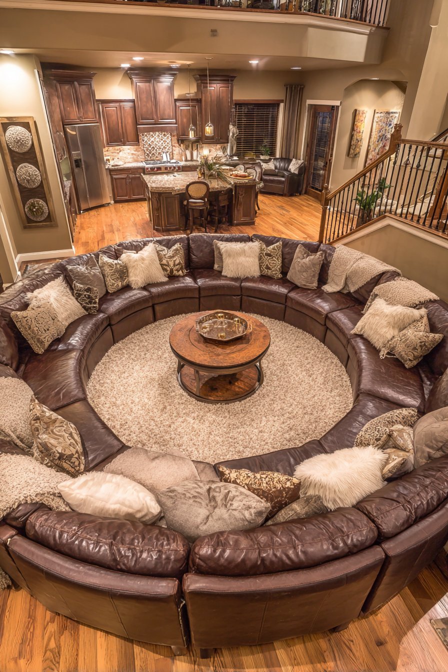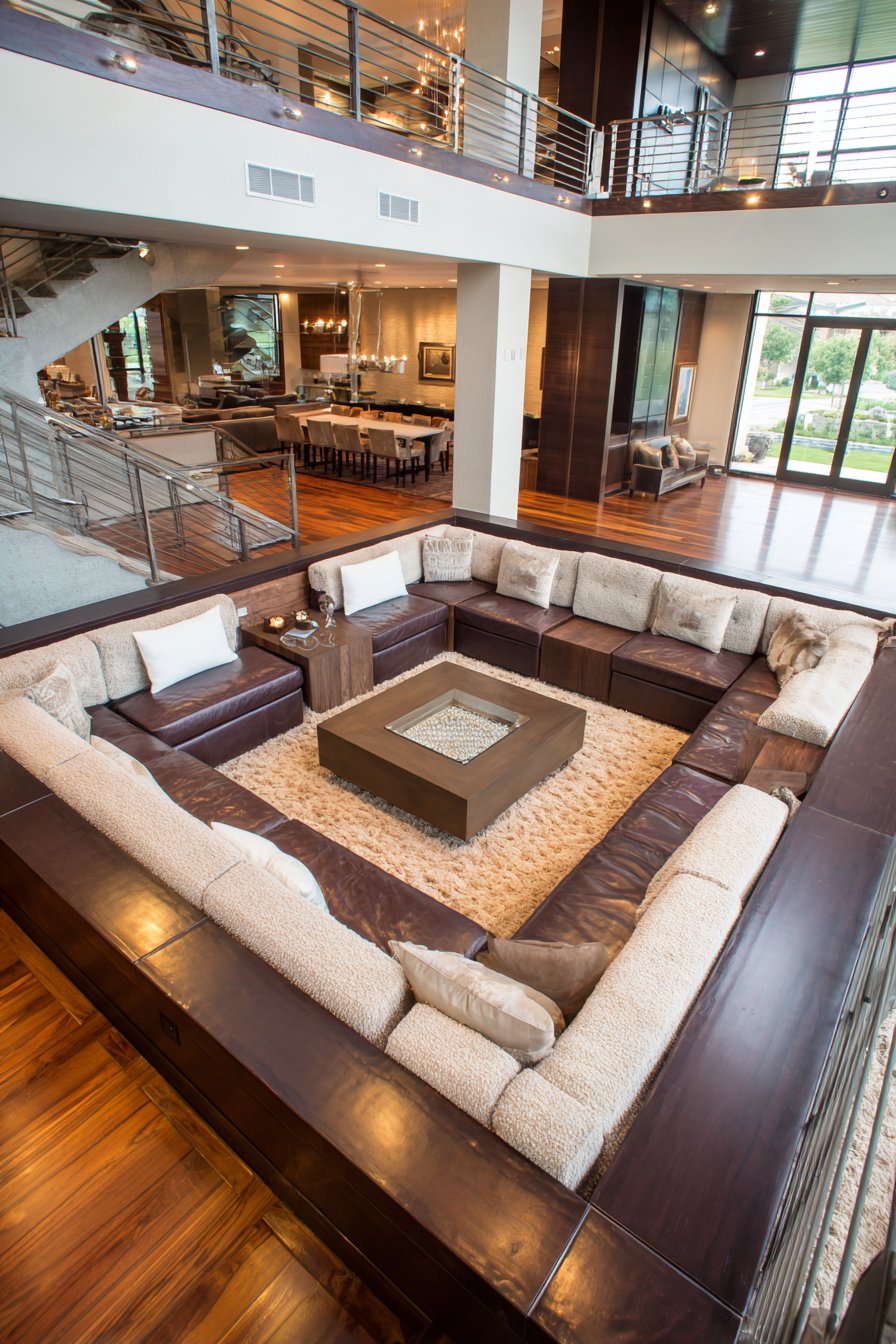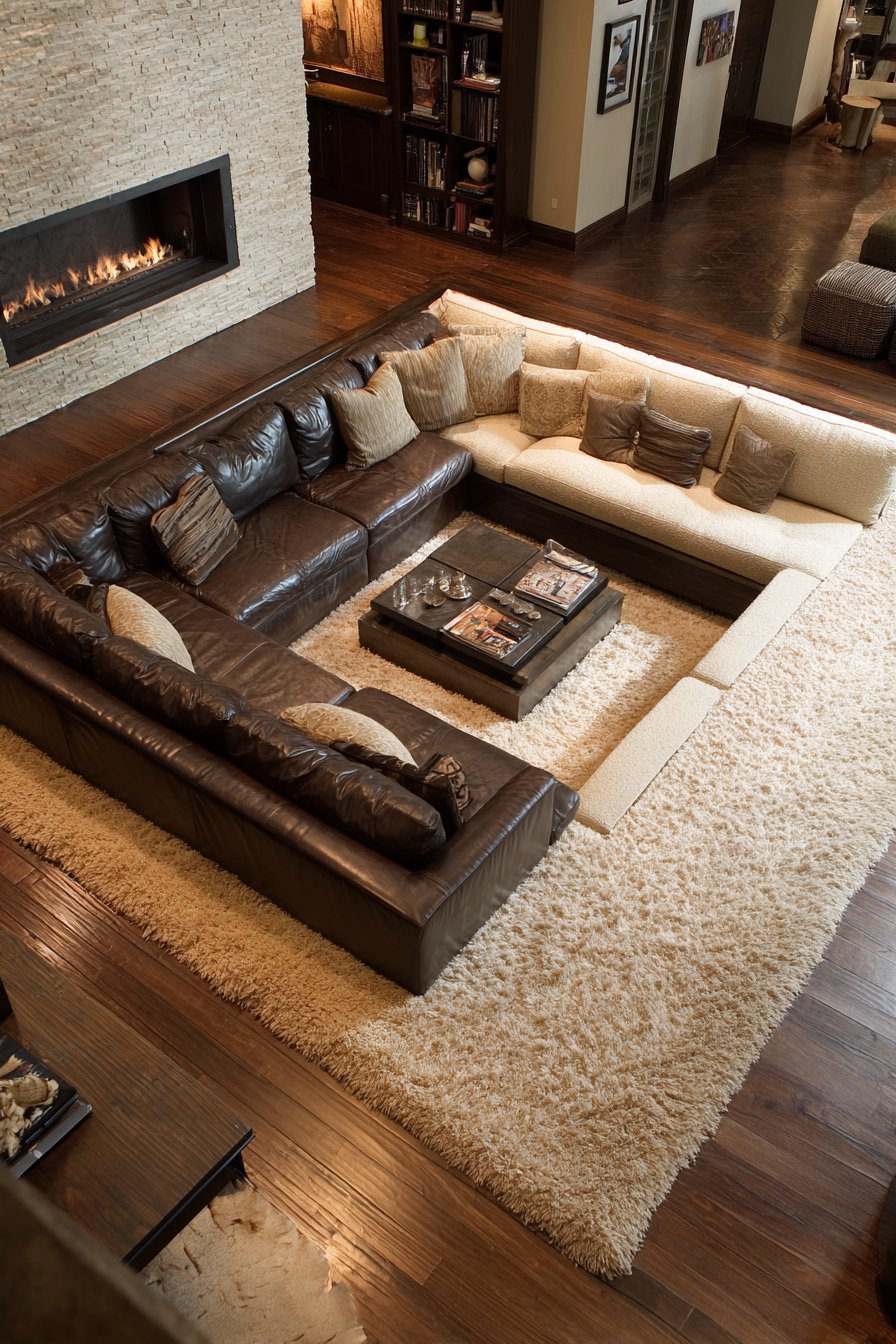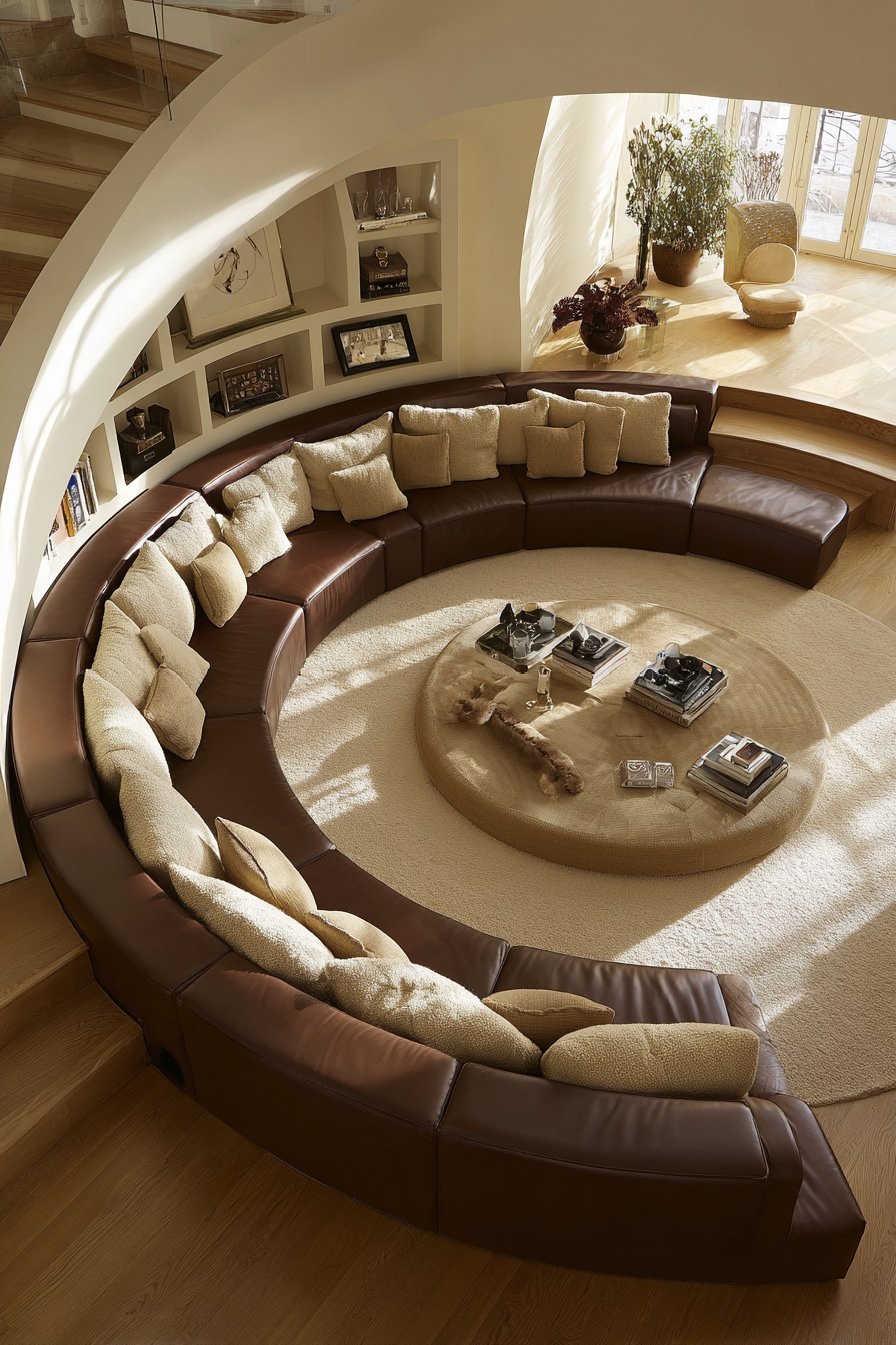 Key Design Tips: Create conversation pits with mixed upholstery—brown leather for durability and beige bouclé for textural contrast. Ensure proper depth (typically 12-18 inches below main floor) for comfort without requiring awkward stepping. Use natural oak hardwood surrounding the pit to extend warm brown tones throughout the space. Define the pit interior with plush rugs in caramel and cream tones for comfort and zone definition. Include adequate cushioning and back support even for built-in seating. Position the pit to take advantage of natural light from windows or skylights. Consider heating elements beneath or within the pit for comfort during cold weather. Ensure code compliance regarding railings and steps if required in your jurisdiction. Use the elevation change to hide storage beneath the pit platform.
