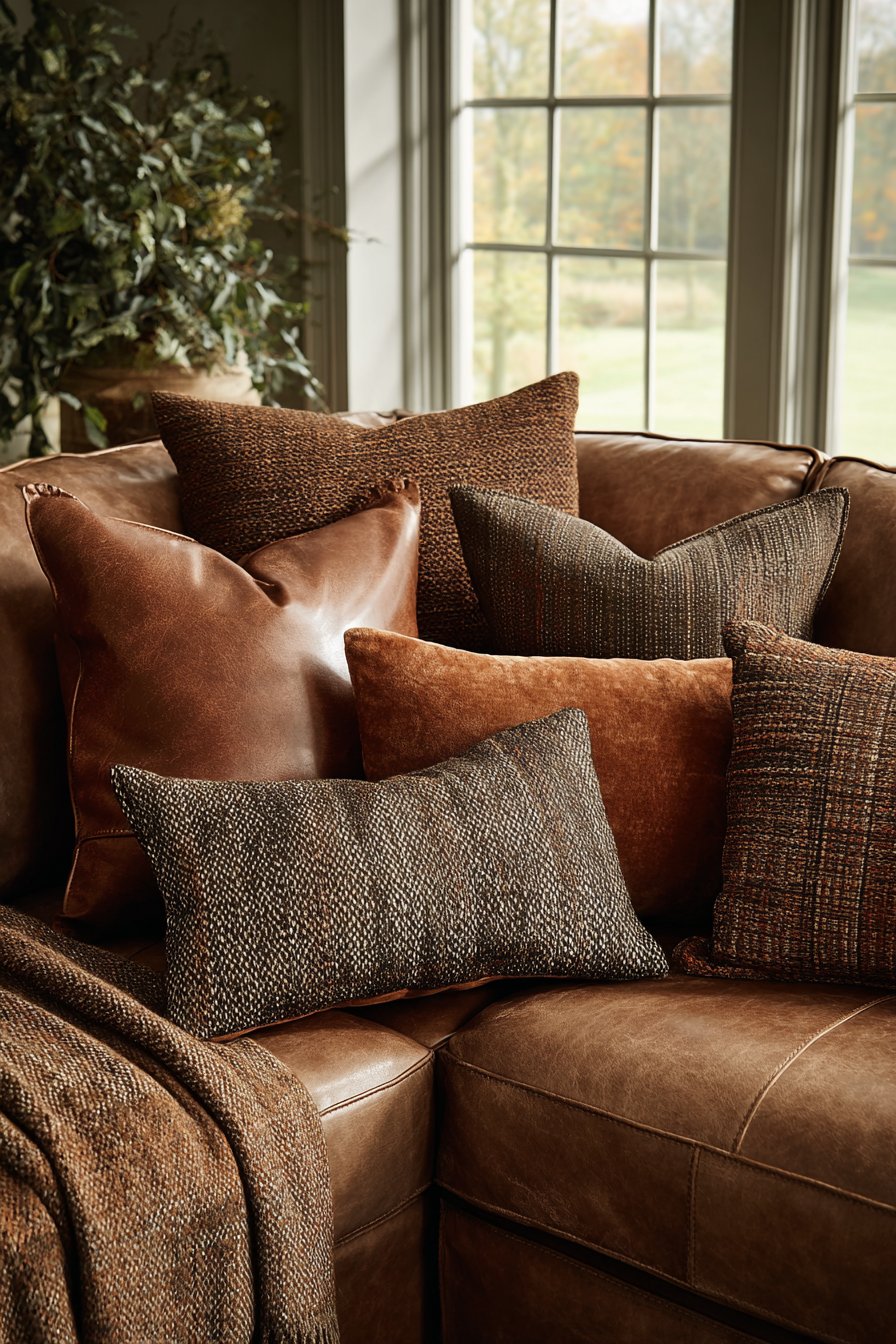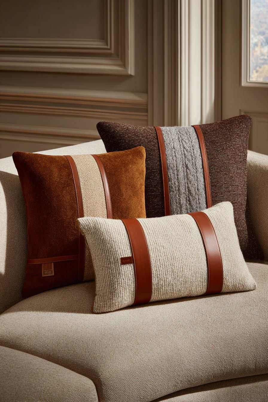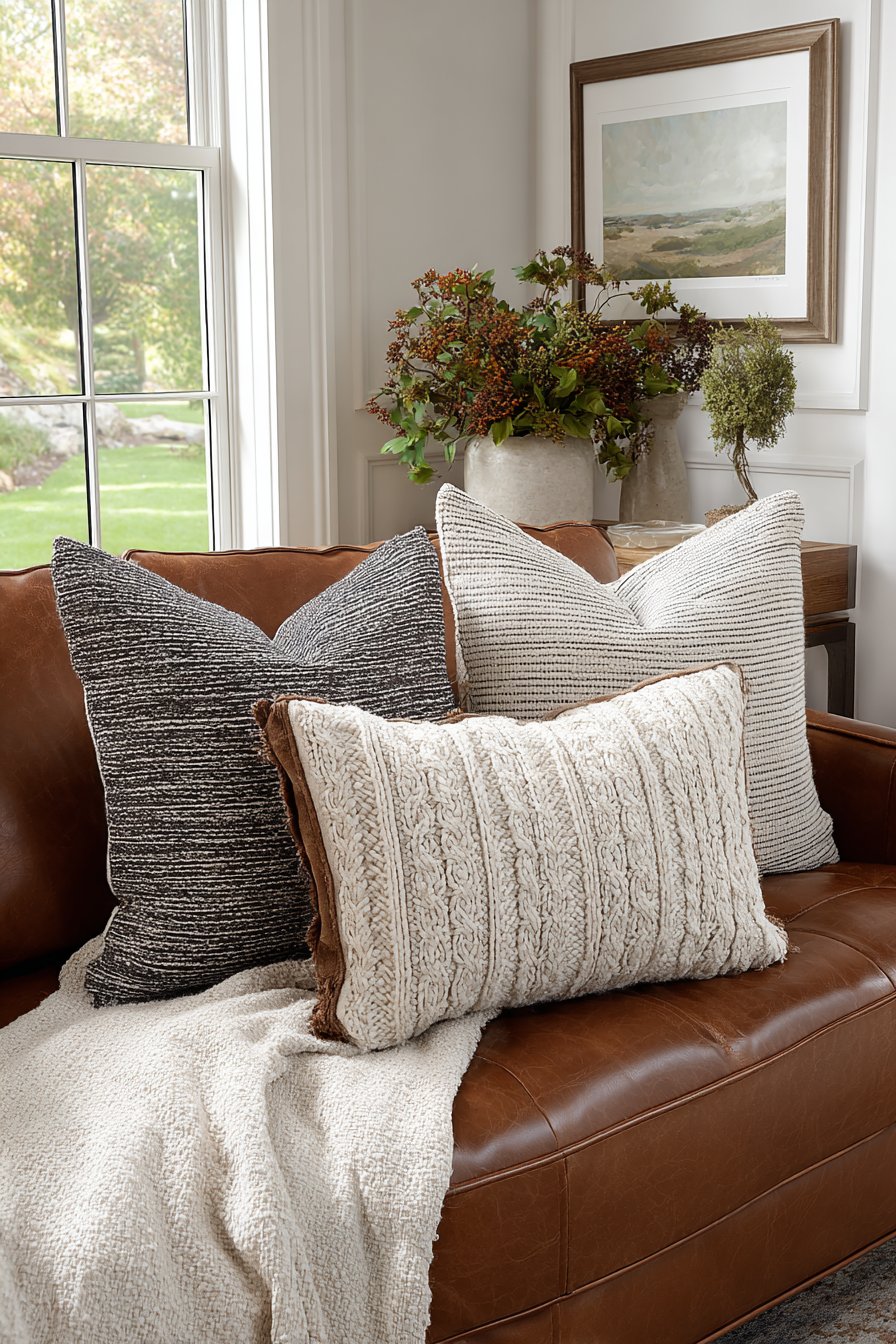 Key Design Tips: Mix pillow textures extensively—suede, linen, leather, and cable knit create varied tactile experiences. Maintain color discipline within brown and beige family while varying tones from cognac to oatmeal. Include one pillow with subtle pattern like tonal stripes to add interest without color competition. Choose varying sizes—start with largest in back, graduate to smaller in front for dimensional display. Allow natural wrinkles and realistic fabric characteristics rather than overly styled perfection. Position pillows at slight angles rather than rigidly straight for casual, lived-in appeal. Include one textured pillow with cable knit or similar dimensional pattern for visual focal point. Change pillow arrangements seasonally—lighter linens in summer, heavier velvets and knits in winter. Select removable covers for easy washing and seasonal changes. Consider pillow density—mix firmer and softer fills for varied comfort and better form retention.