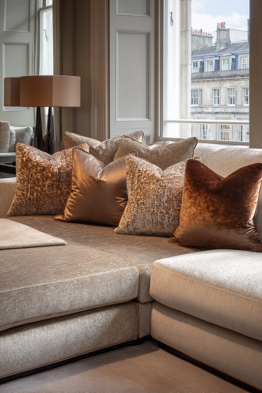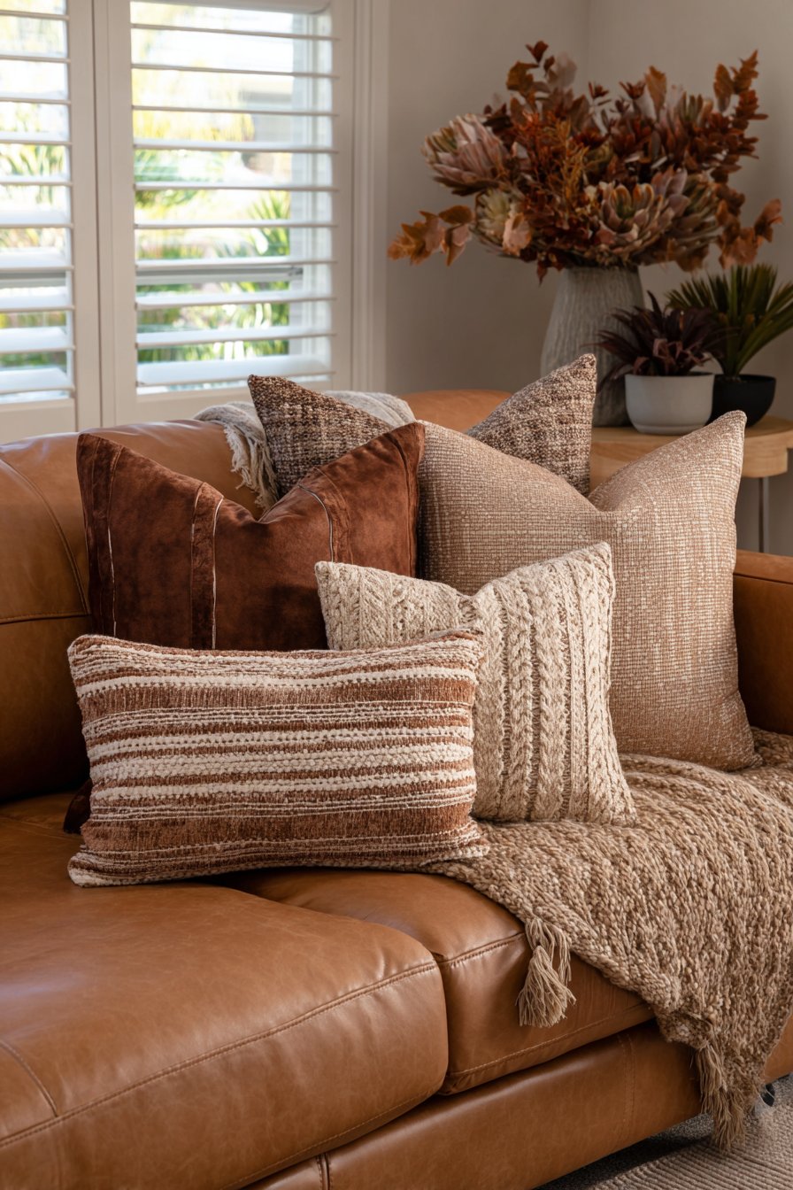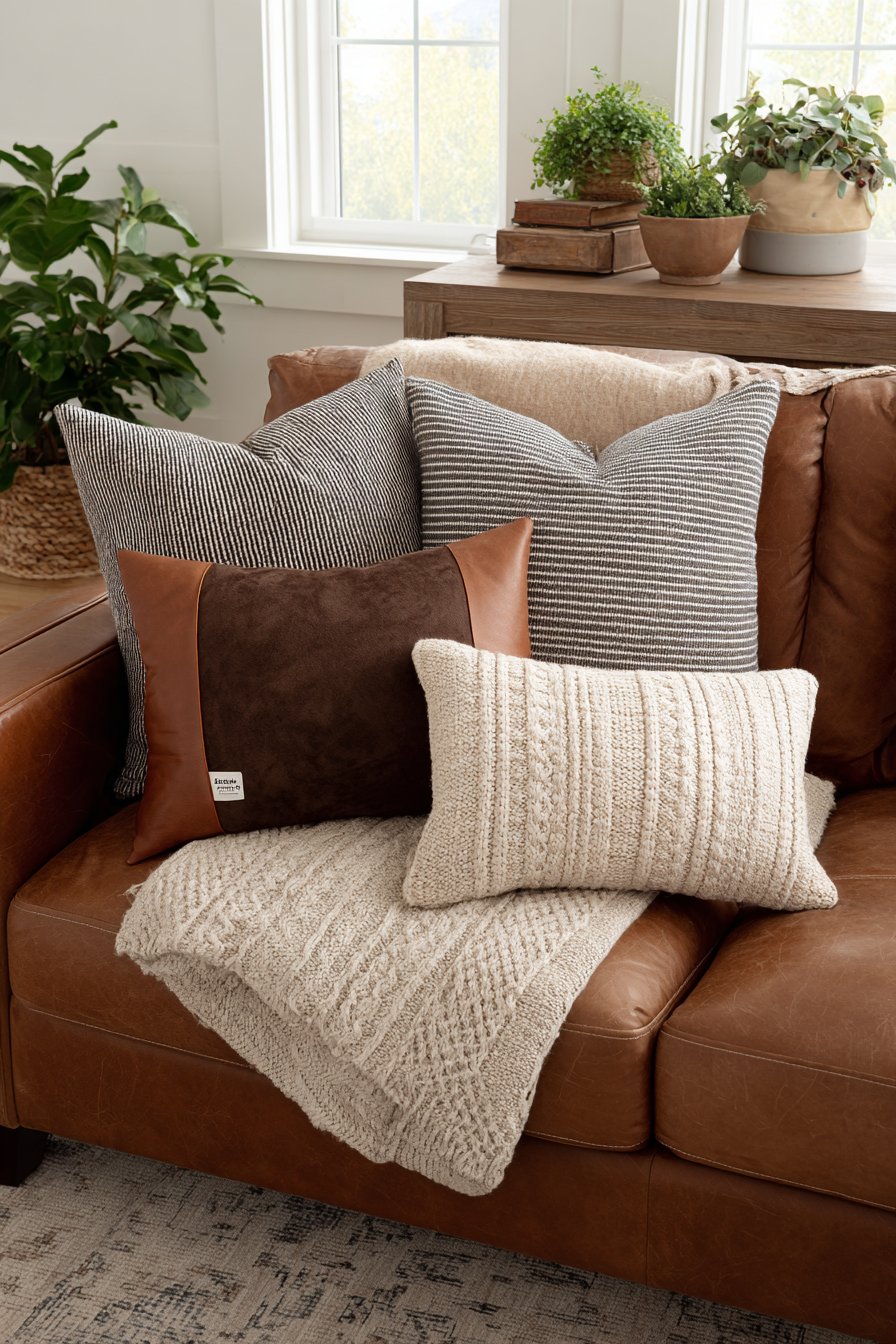 Key Design Tips: Mix pillow textures extensively—suede, linen, leather, and cable knit create varied tactile experiences. Maintain color discipline within brown and beige family while varying tones from cognac to oatmeal. Include one pillow with subtle pattern like tonal stripes to add interest without color competition. Choose varying sizes—start with largest in back, graduate to smaller in front for dimensional display. Allow natural wrinkles and realistic fabric characteristics rather than overly styled perfection. Position pillows at slight angles rather than rigidly straight for casual, lived-in appeal. Include one textured pillow with cable knit or similar dimensional pattern for visual focal point. Change pillow arrangements seasonally—lighter linens in summer, heavier velvets and knits in winter. Select removable covers for easy washing and seasonal changes. Consider pillow density—mix firmer and softer fills for varied comfort and better form retention.
