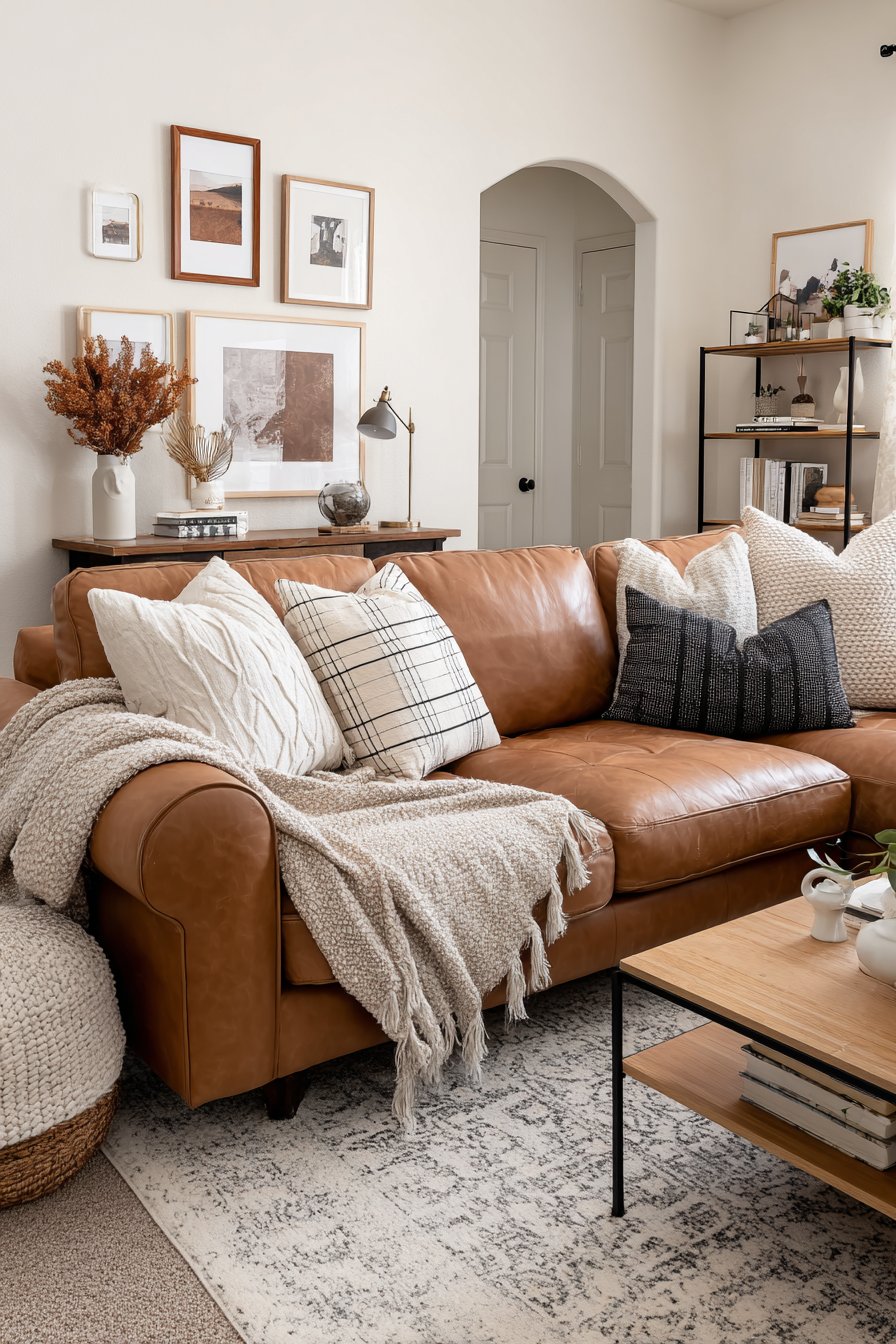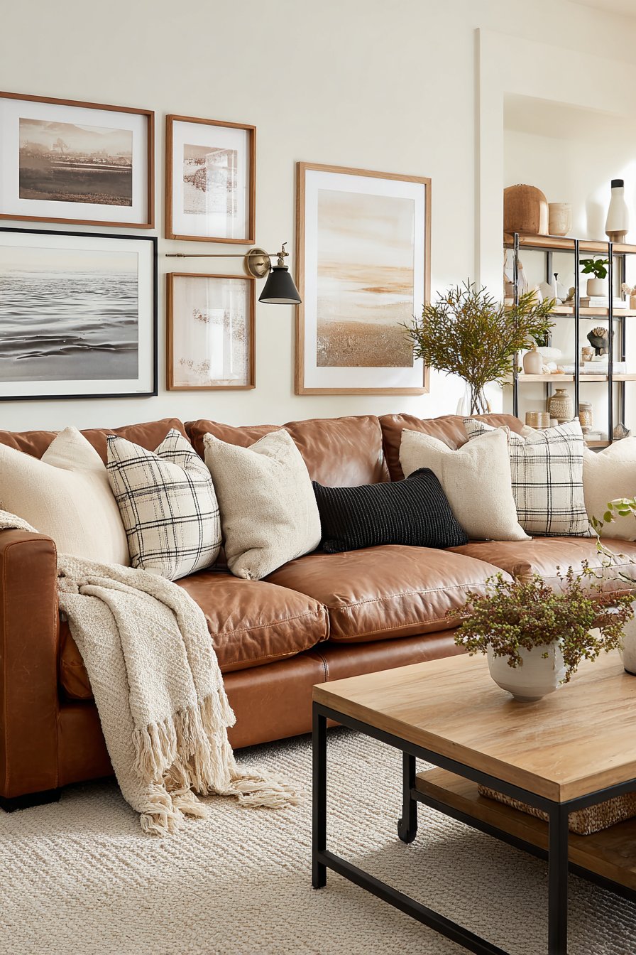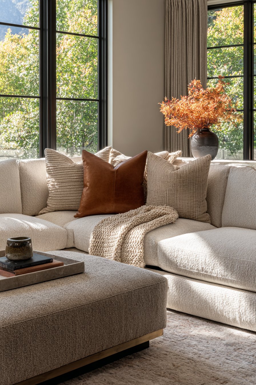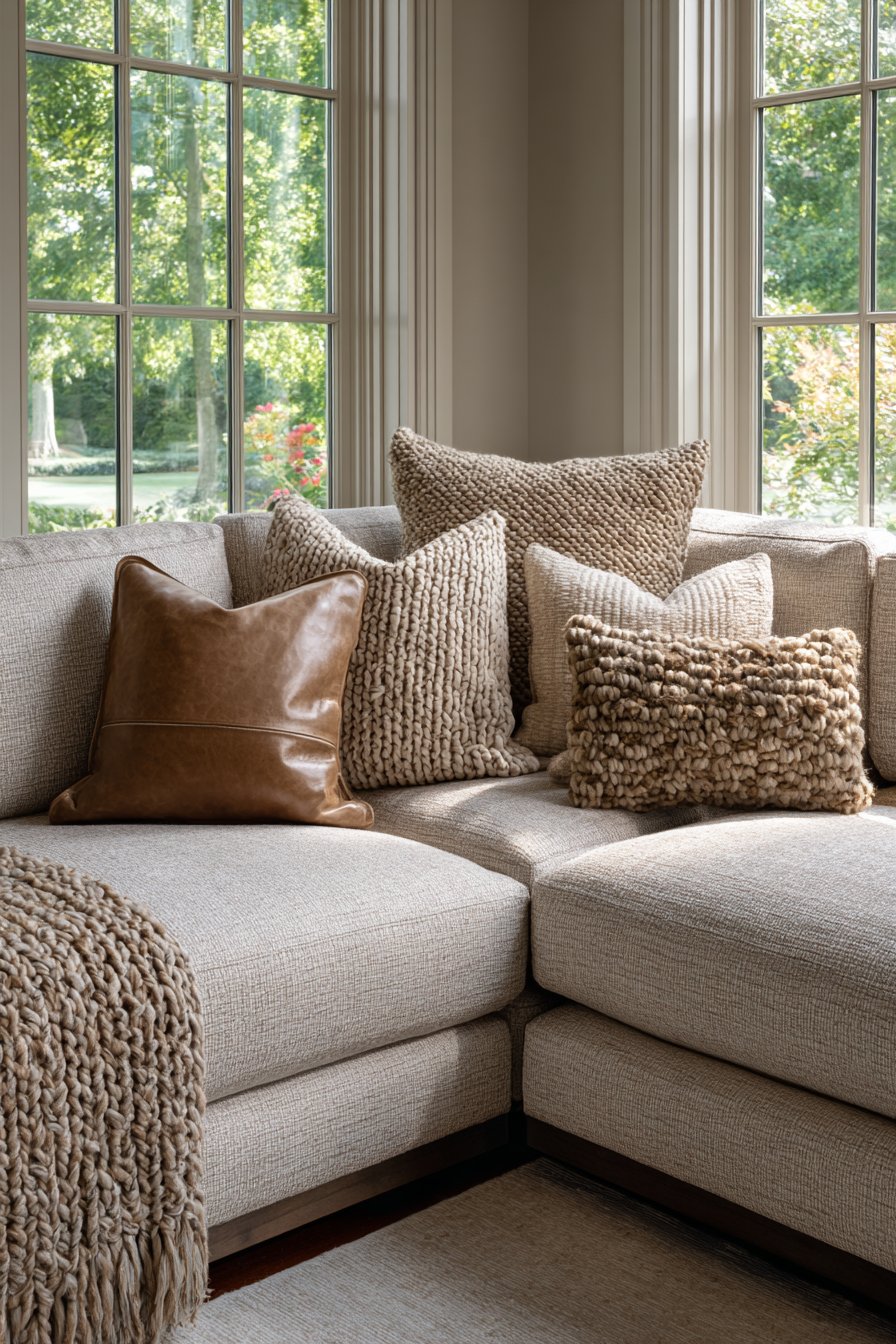 The art of textile layering creates spaces that feel collected, comfortable, and visually rich. This living room demonstrates sophisticated textile mixing through a beige performance fabric sectional that serves as the neutral foundation. Upon this base, styling begins with brown leather pillows—their smooth surface and slight sheen contrasting beautifully with the matte fabric sectional. These might be genuine leather or high-quality faux alternatives in cognac or tobacco brown, adding richness and subtle formality.