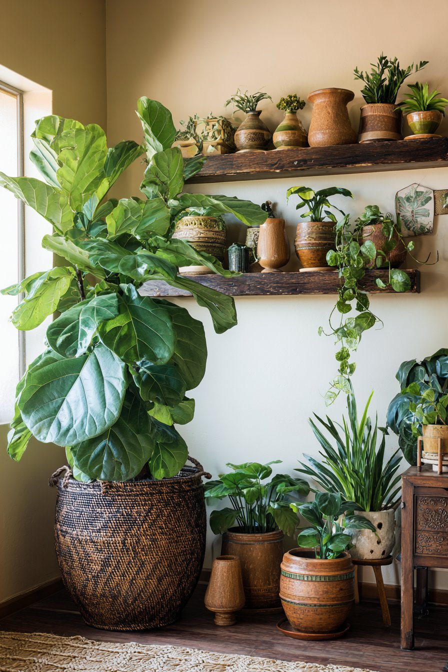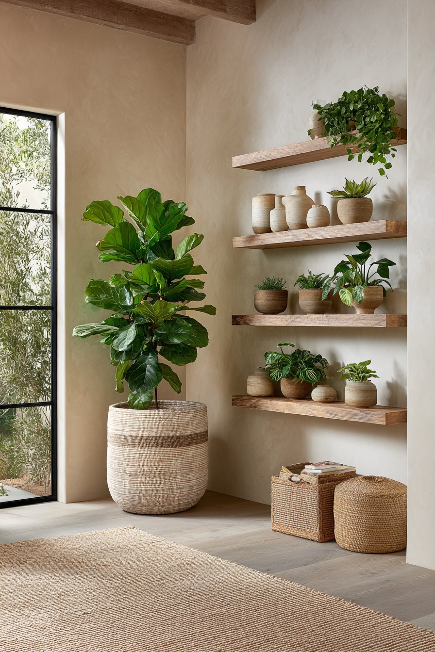 Key Design Tips: Use brown woven basket planters for large floor plants to add natural texture while maintaining the earth-tone palette. Choose beige ceramic vessels in simple forms for medium plants to provide clean, neutral containers. Display trailing plants on floating shelves in walnut or brown woods to create living softness. Group plants at varied heights to create visual interest and fill different spatial zones. Position plants according to light requirements—bright indirect for fiddles, lower light for pothos. Define plant display areas with jute rugs in natural tan tones to ground the botanical grouping. Consider plant scale relative to containers—overly large pots overwhelm small plants, insufficient pots destabilize large specimens. Include humidity-loving plants in brown and beige bathrooms where they’ll thrive in natural steam. Rotate plants periodically for even growth and to prevent one-sided leaning toward light sources.