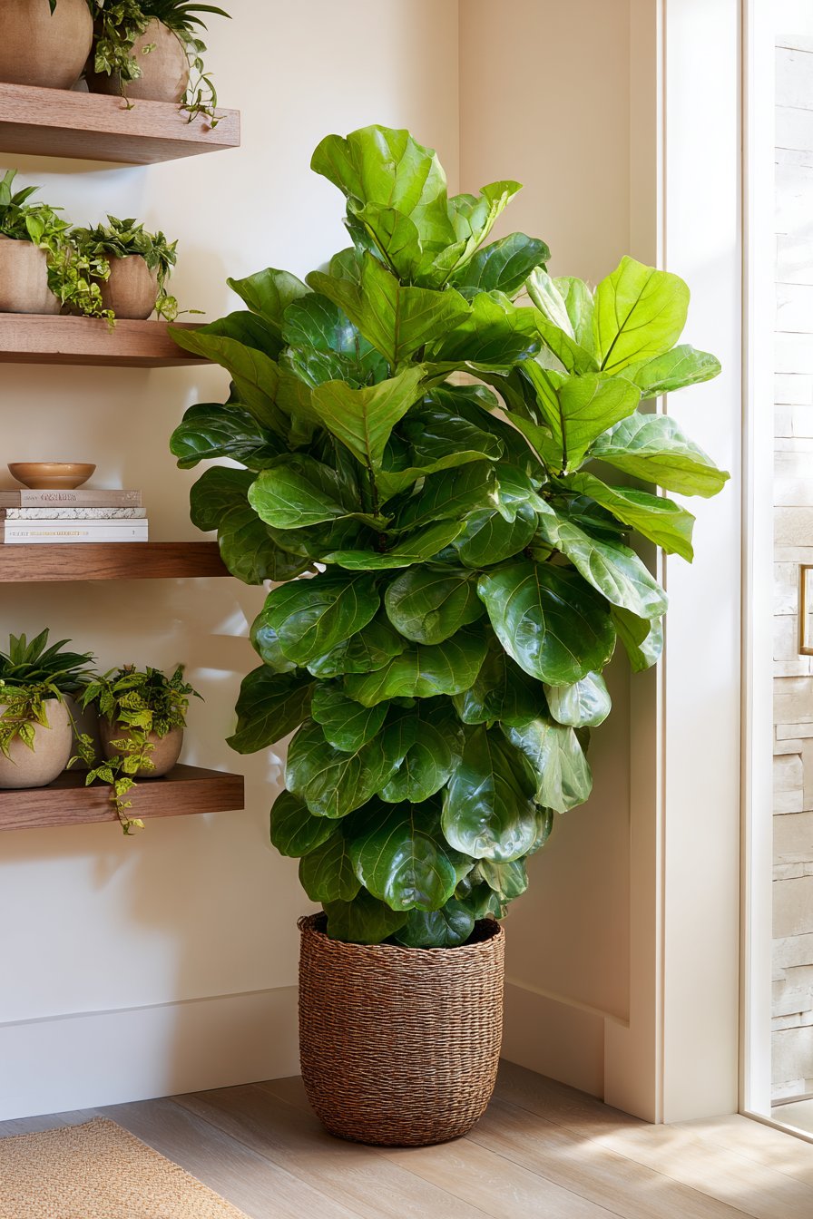 Plants bring life, color, and air-purifying benefits to any interior, and this botanical display demonstrates how to incorporate greenery while maintaining the brown and beige aesthetic through thoughtful container selection. A large fiddle leaf fig, potted in a brown woven basket planter, serves as the room’s living sculpture. The basket’s natural fiber construction in deep brown tones adds organic texture while its substantial size accommodates the fig’s root system. The woven pattern creates visual interest, and the basket’s handles provide practical portability for occasional repositioning.