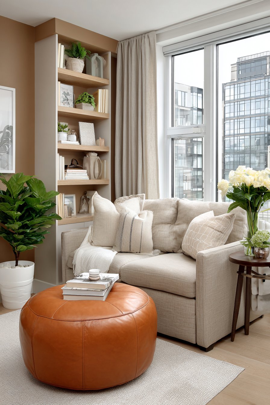Wall-mounted shelving in light oak provides essential storage and display without consuming floor space. Floating shelves create the illusion of more square footage by keeping the floor visible beneath while providing necessary storage for books, decorative objects, and daily items. A multi-functional ottoman in tan leather serves triple duty as footrest, occasional seating, and hidden storage with a lift-up top. The ottoman’s compact size and neutral tone ensure it integrates seamlessly while its functionality proves essential in the space-challenged room. Professional photography captures the efficient furniture placement and cohesive brown and beige color scheme that makes the compact area feel intentional rather than cramped, with natural daylight streaming through windows to enhance the sense of openness.