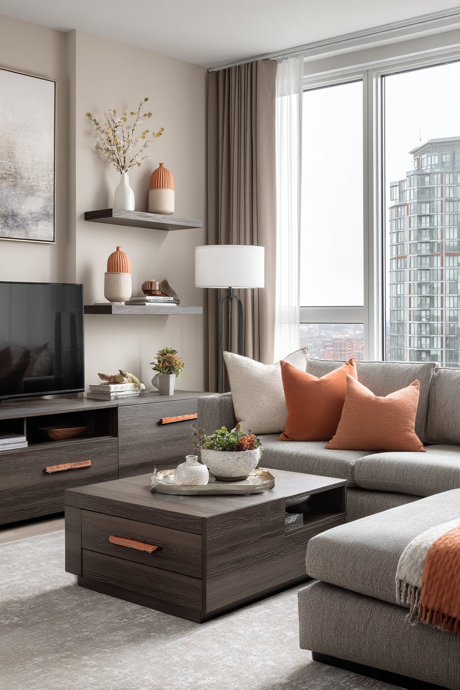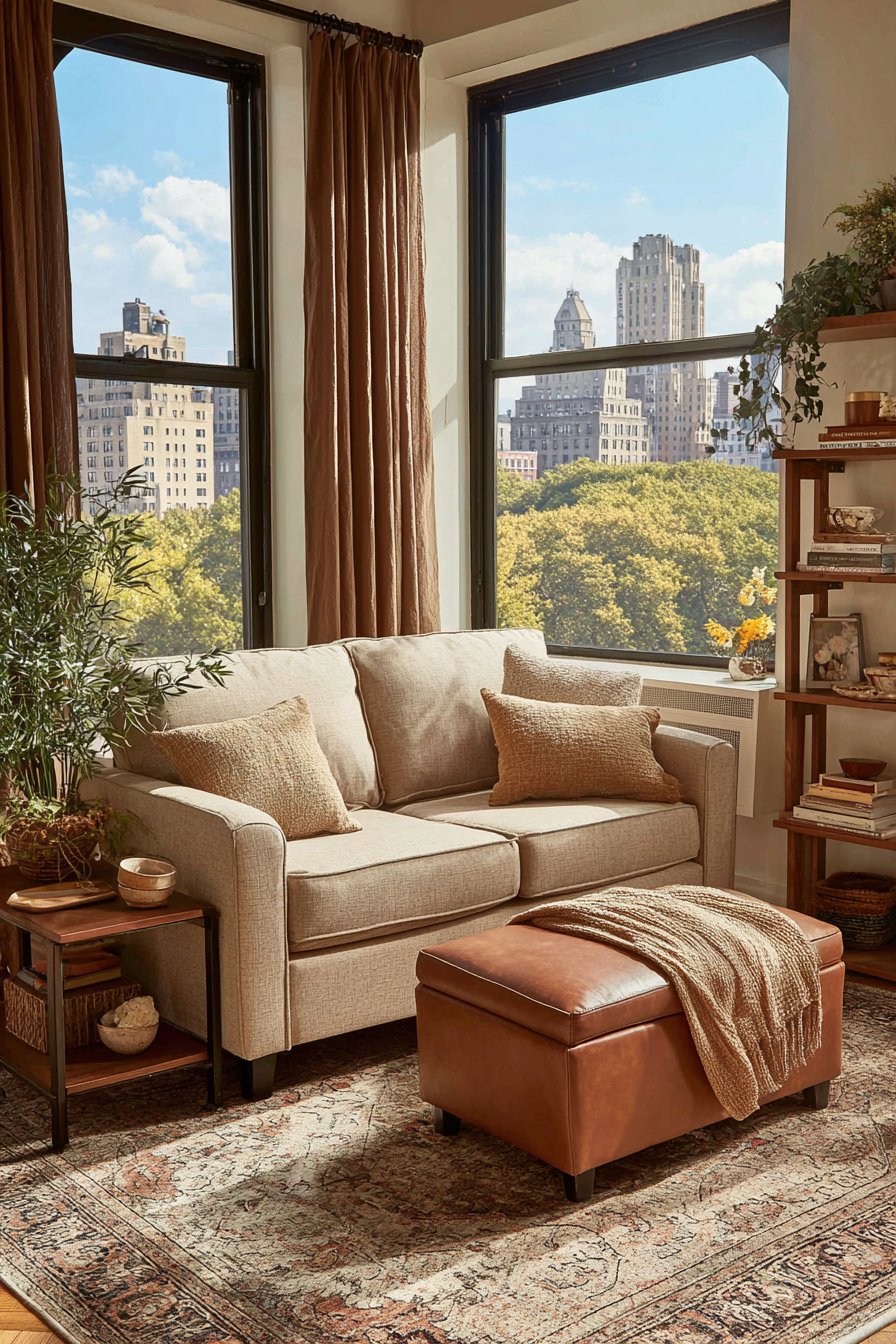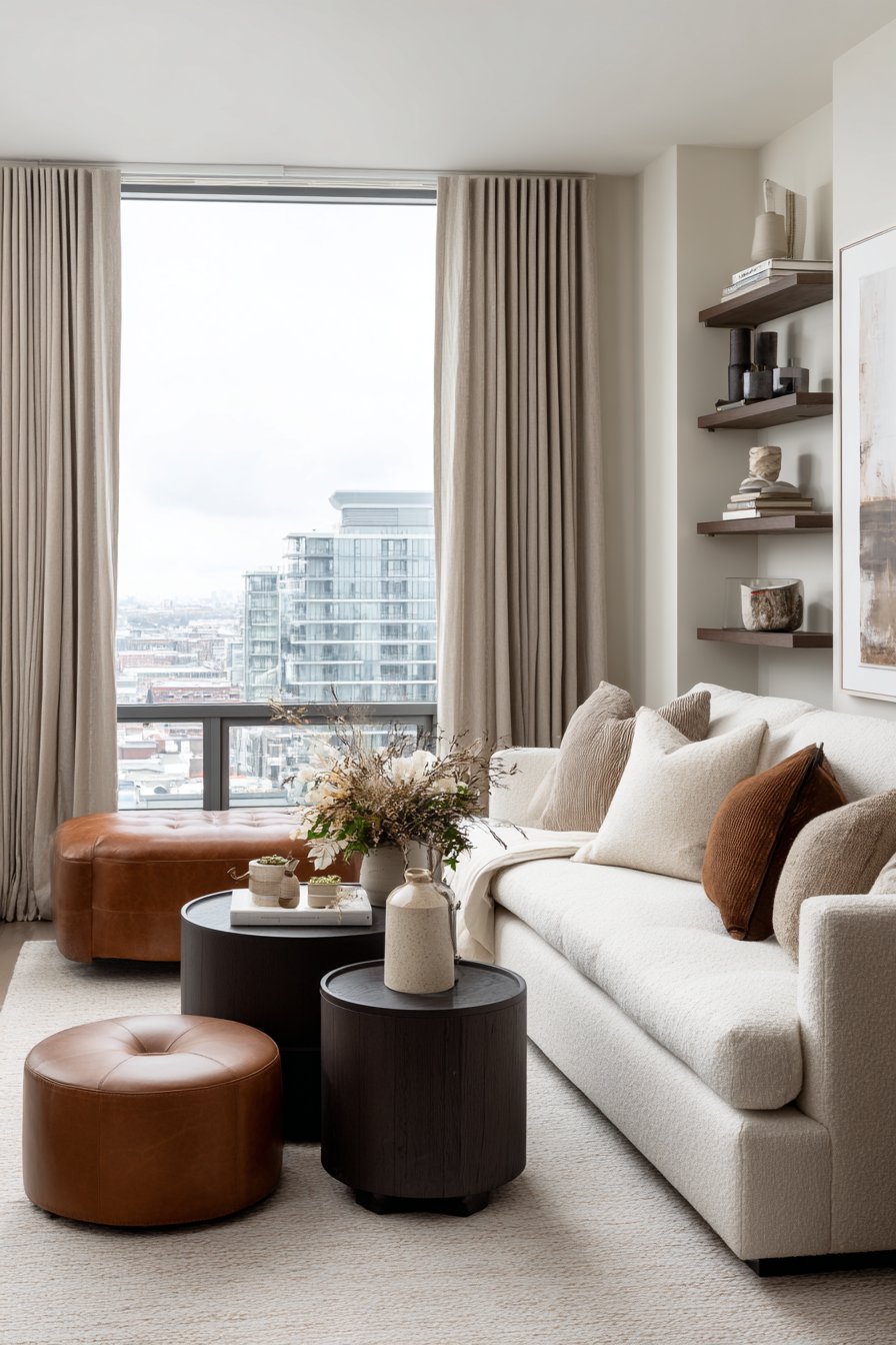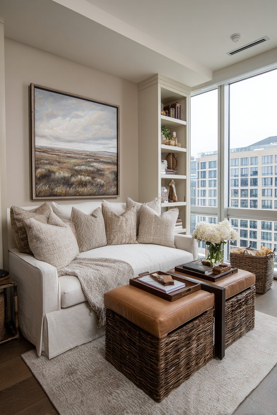 Key Design Tips: Choose loveseats or apartment-sized sofas in beige to provide seating without overwhelming small spaces. Select furniture with raised legs to create visible floor space and enhance the sense of openness. Use nesting tables in graduated brown wood tones for flexible surface area that can expand or contract as needed. Install floating shelves in light wood to provide storage without consuming floor space. Incorporate multi-functional furniture like storage ottomans in tan leather for maximum utility in limited square footage. Maintain strict adherence to neutral palette to create visual continuity and prevent color competition. Use mirrors strategically to reflect light and create the illusion of more space. Keep window treatments minimal—sheer beige panels or simple Roman shades rather than heavy drapes. Edit accessories ruthlessly to prevent cluttered appearance in small quarters. Choose furniture with similar visual weight to create cohesive flow rather than jarring contrasts.