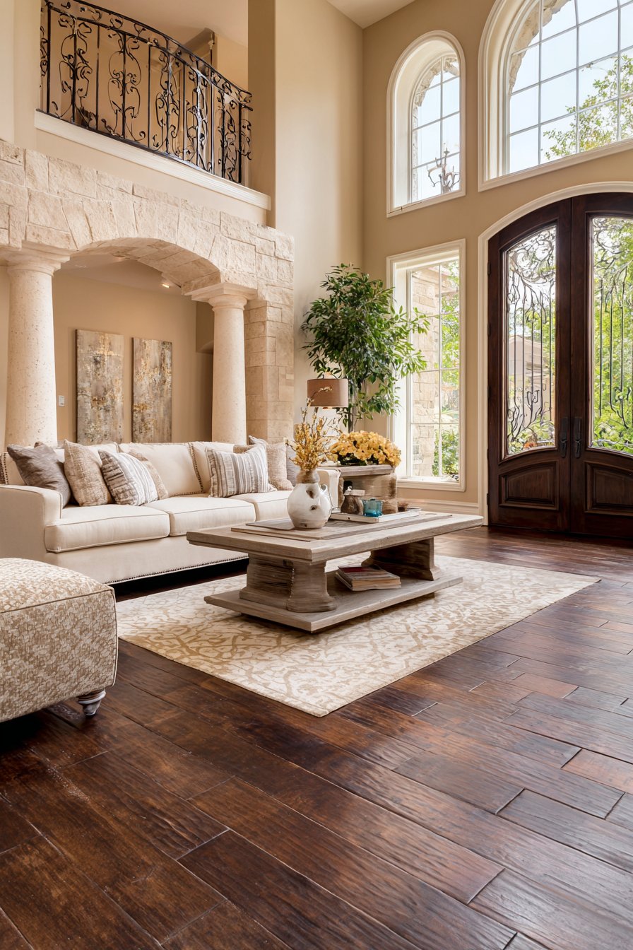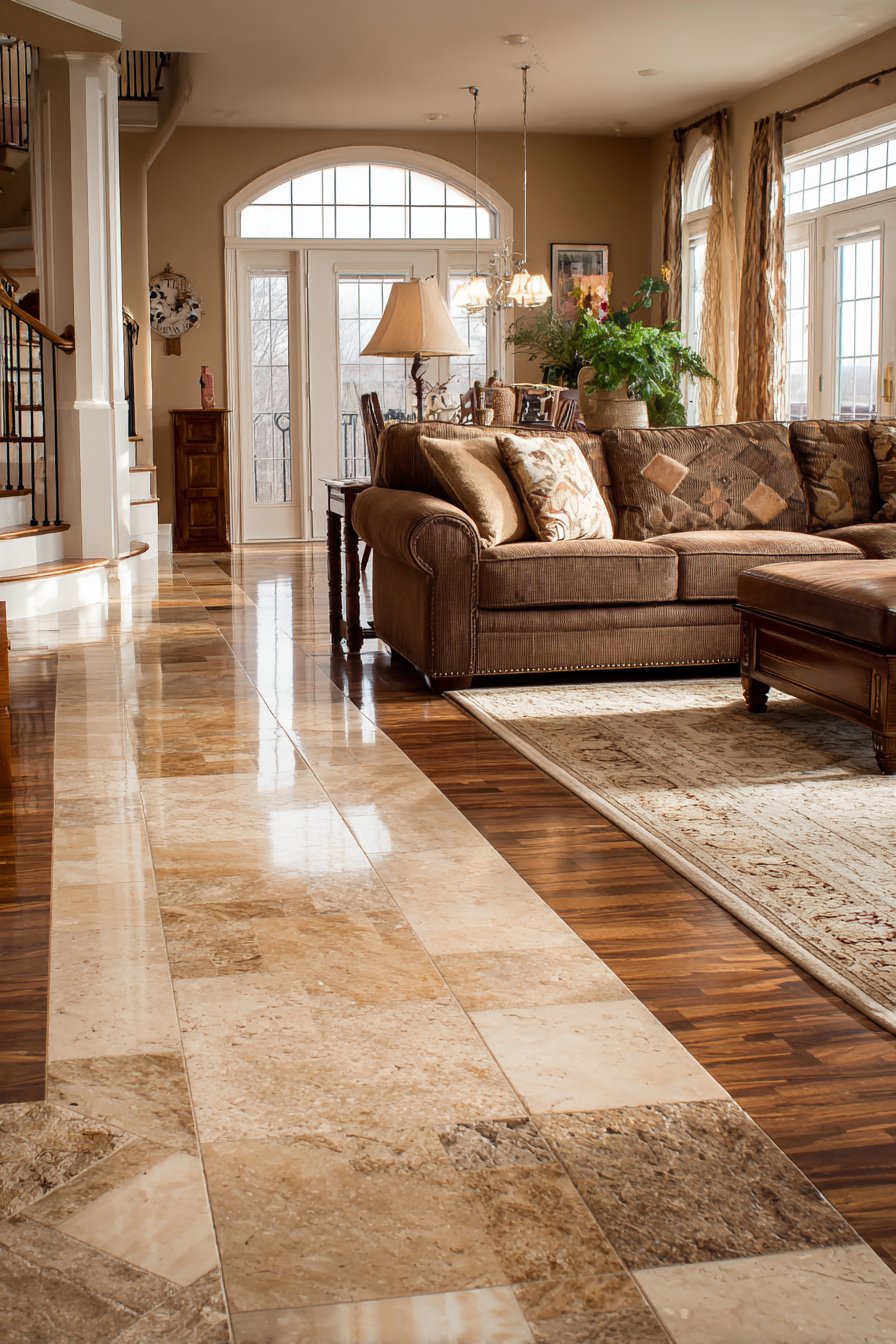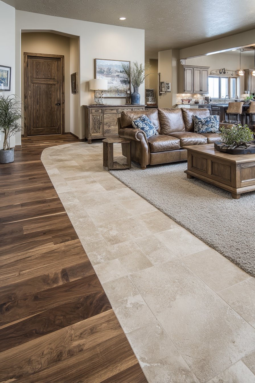 Key Design Tips: Use dark brown hardwood in wide planks for main living areas to create warmth and make spaces feel more expansive. Select beige natural stone tile for entries and high-traffic zones for durability and moisture resistance. Bridge flooring transitions with area rugs in variegated beige and taupe that pull colors from both materials. Ensure transition strips between different floor materials are clean and properly installed. Consider floor height consistency to prevent tripping hazards at transition points. Choose flooring materials with similar undertones—warm wood with warm stone, cool with cool. Extend area rugs partially onto both floor types to create visual connection. Consider maintenance requirements—stone may need periodic sealing, wood requires refinishing eventually. Use furniture placement to help define zones with different flooring materials. Plan flooring transitions to occur at natural architectural divisions like doorways or room boundaries rather than mid-space.