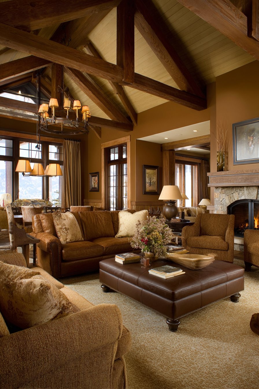 Looking upward reveals often-overlooked design opportunities, and this living room’s ceiling design creates dramatic impact through exposed wooden beams in rich brown stain. The substantial beams, perhaps reclaimed timber or new wood aged with stain, span the ceiling at regular intervals, adding architectural interest and emphasizing the room’s dimensions. The deep brown stain—possibly walnut, chestnut, or custom-mixed dark brown—creates striking contrast against the beige painted ceiling between beams while adding visual weight that grounds the overhead plane.