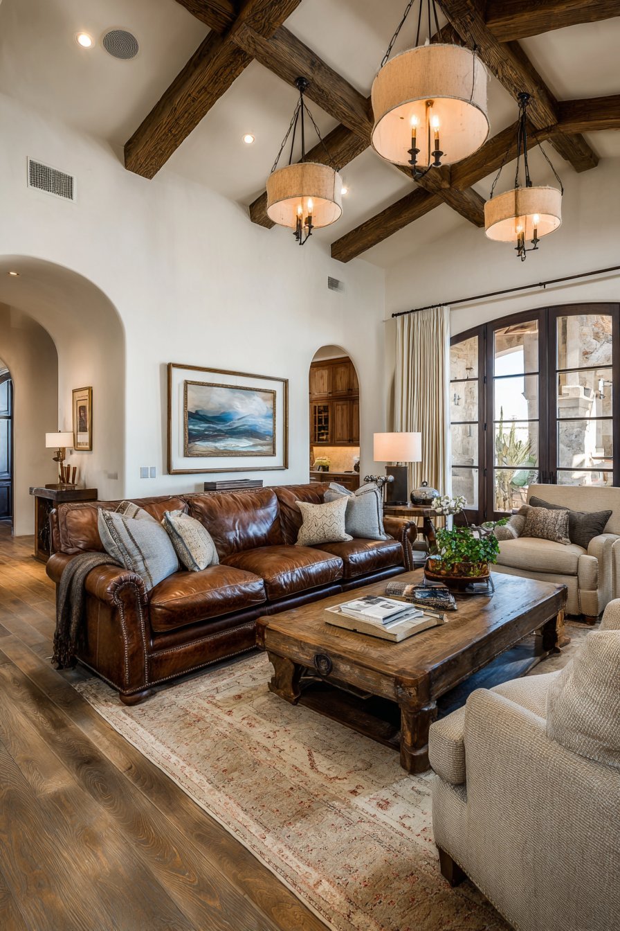Key Design Tips: Install or expose ceiling beams in rich brown stains to add architectural drama and visual interest overhead. Paint ceiling surfaces between beams in beige tones to create contrast while maintaining the neutral palette. Hang pendant lights with beige fabric shades from beam structure for functional lighting that reinforces the color story. Choose leather furniture in brown tones that echo beam color to create vertical design continuity. Consider beam spacing relative to room proportions—closer spacing in smaller rooms, wider in larger spaces. Ensure beams are properly supported and installed to code, especially if adding to existing construction. Use beams to define zones in open floor plans by running them perpendicular to natural space divisions. Add LED strip lighting along beam tops to create dramatic uplighting on beige ceilings. Consider acoustic benefits of beam installation in reducing echo in high-ceilinged spaces. Stain beams to match existing woodwork or furniture for cohesive appearance, or choose contrasting tones for more dramatic effect.