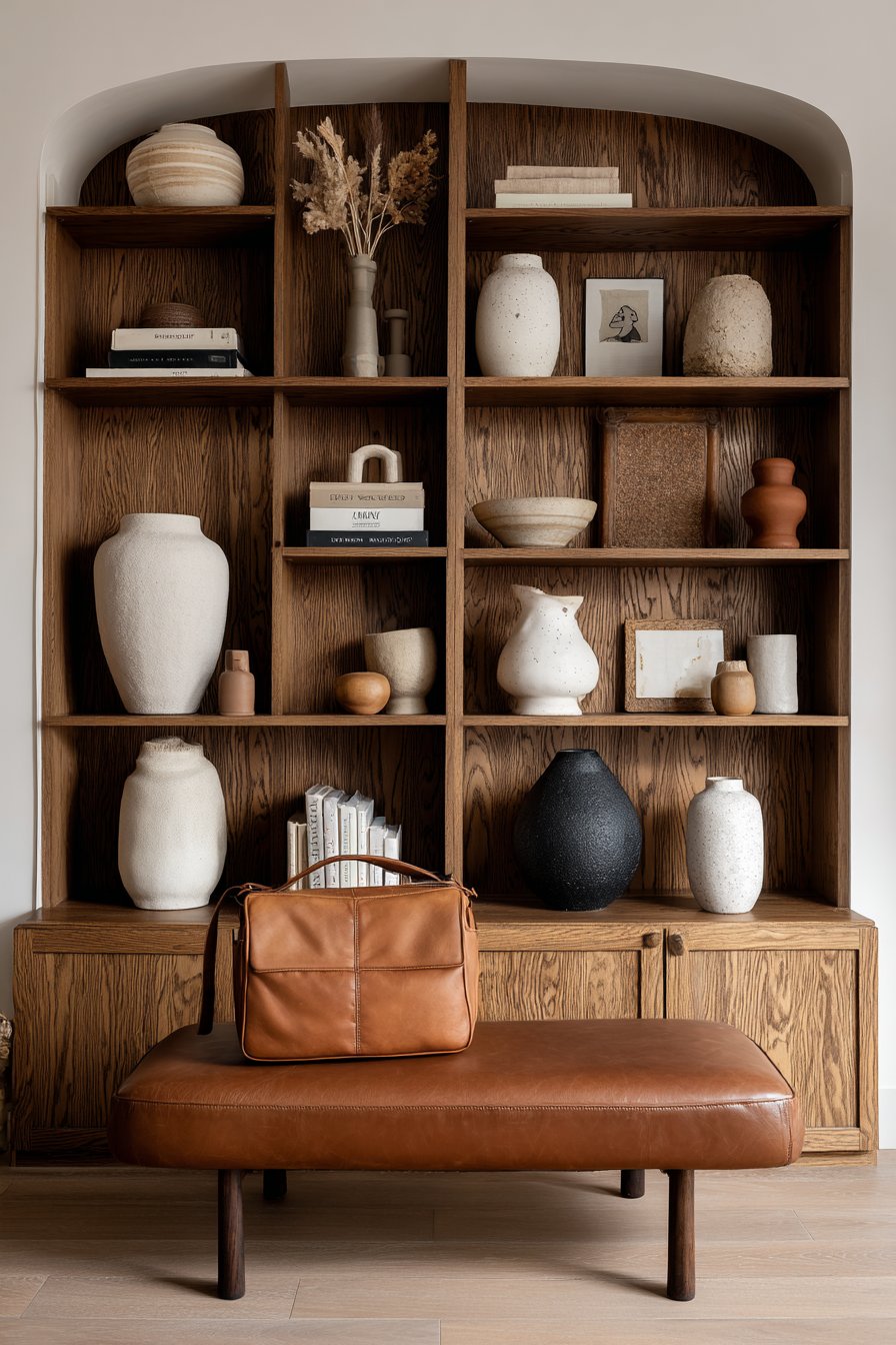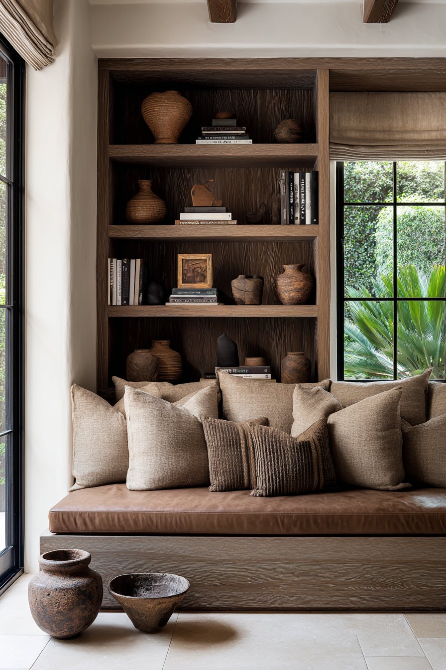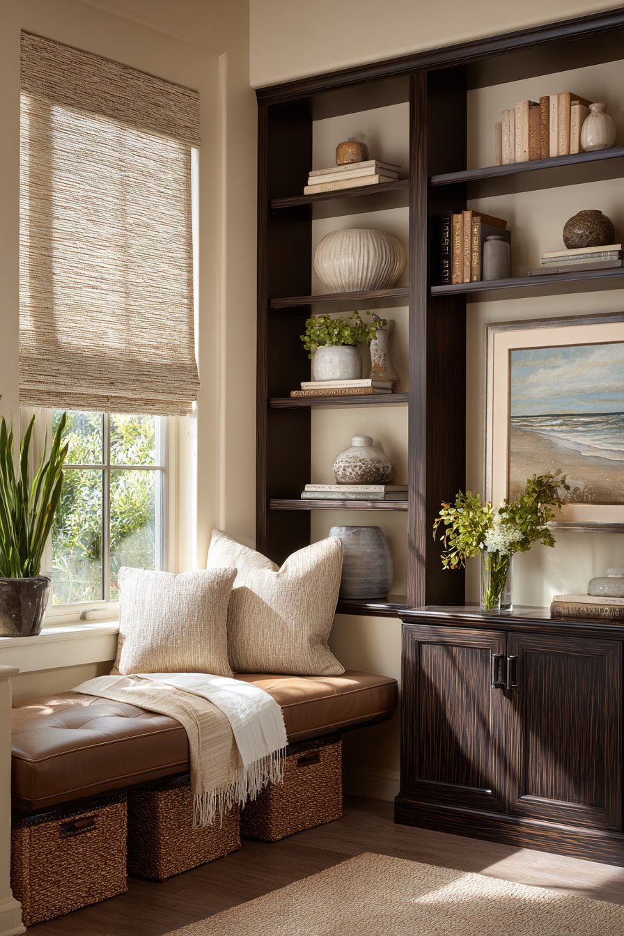 Key Design Tips: Install floor-to-ceiling built-in shelving to maximize vertical storage and create architectural impact. Choose espresso or dark brown stained oak for dramatic contrast against beige walls. Display ceramic vessels in cream and white tones to create visual focus against dark shelving. Arrange books with neutral spines in organized stacks to maintain the color scheme and create rhythm. Incorporate Roman shades in beige linen for light control that complements rather than competes with the color palette. Add a leather bench below windows for multi-functional seating and storage. Leave adequate negative space when styling shelves to prevent visual clutter and allow objects to be appreciated. Use adjustable shelving to accommodate various object heights and allow for future flexibility.