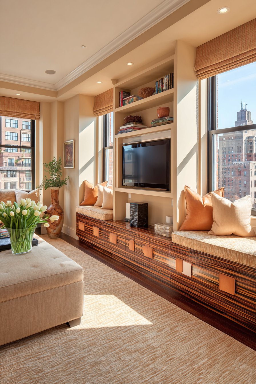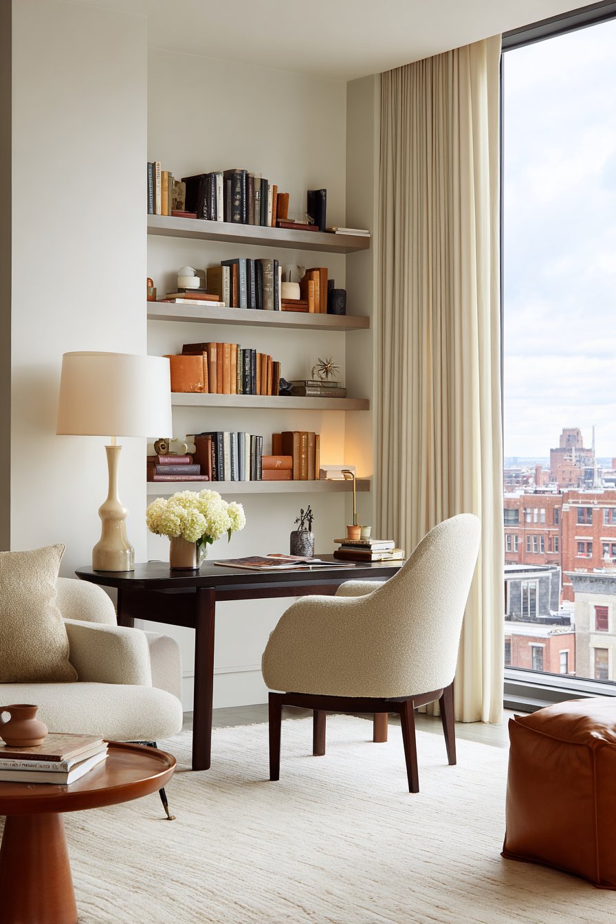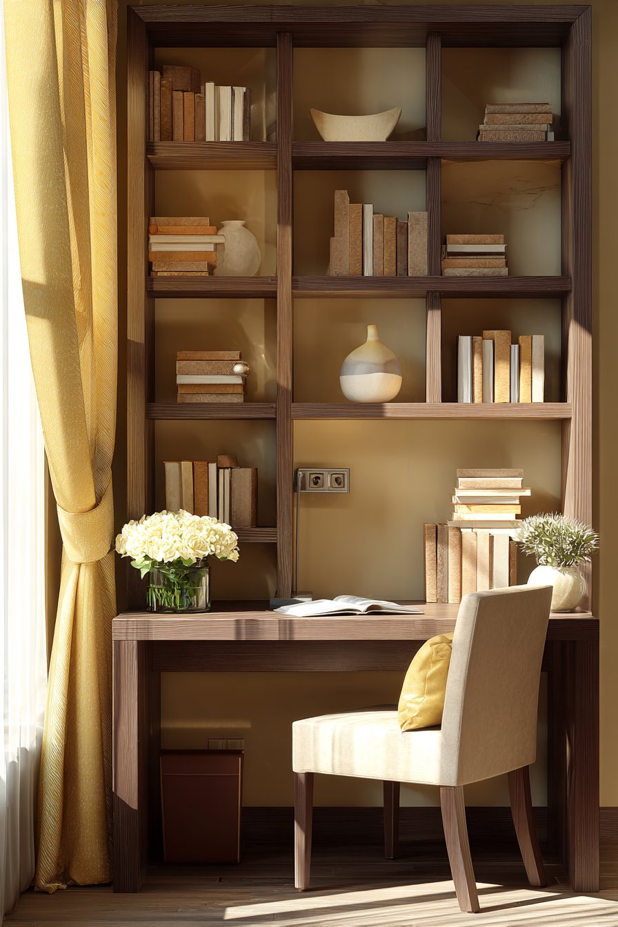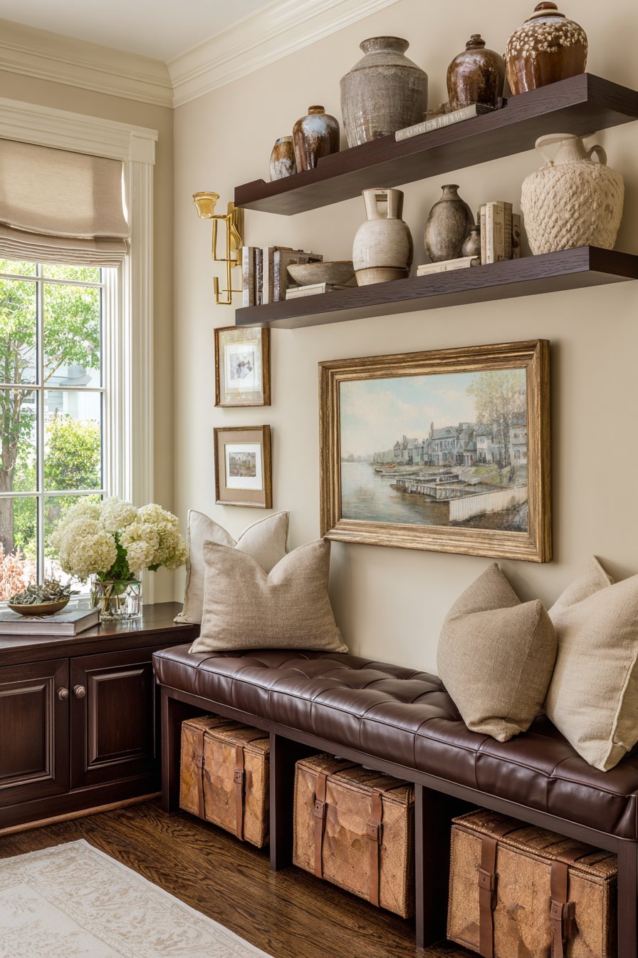 Key Design Tips: Install floor-to-ceiling built-in shelving to maximize vertical storage and create architectural impact. Choose espresso or dark brown stained oak for dramatic contrast against beige walls. Display ceramic vessels in cream and white tones to create visual focus against dark shelving. Arrange books with neutral spines in organized stacks to maintain the color scheme and create rhythm. Incorporate Roman shades in beige linen for light control that complements rather than competes with the color palette. Add a leather bench below windows for multi-functional seating and storage. Leave adequate negative space when styling shelves to prevent visual clutter and allow objects to be appreciated. Use adjustable shelving to accommodate various object heights and allow for future flexibility.
